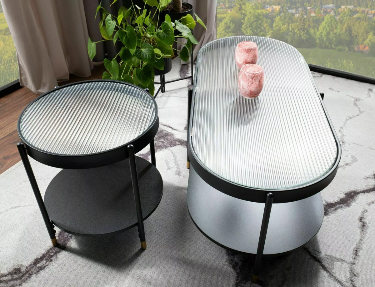 • Elegáns megjelenés az átlátszó üveg és matt fekete fém kombinációjával