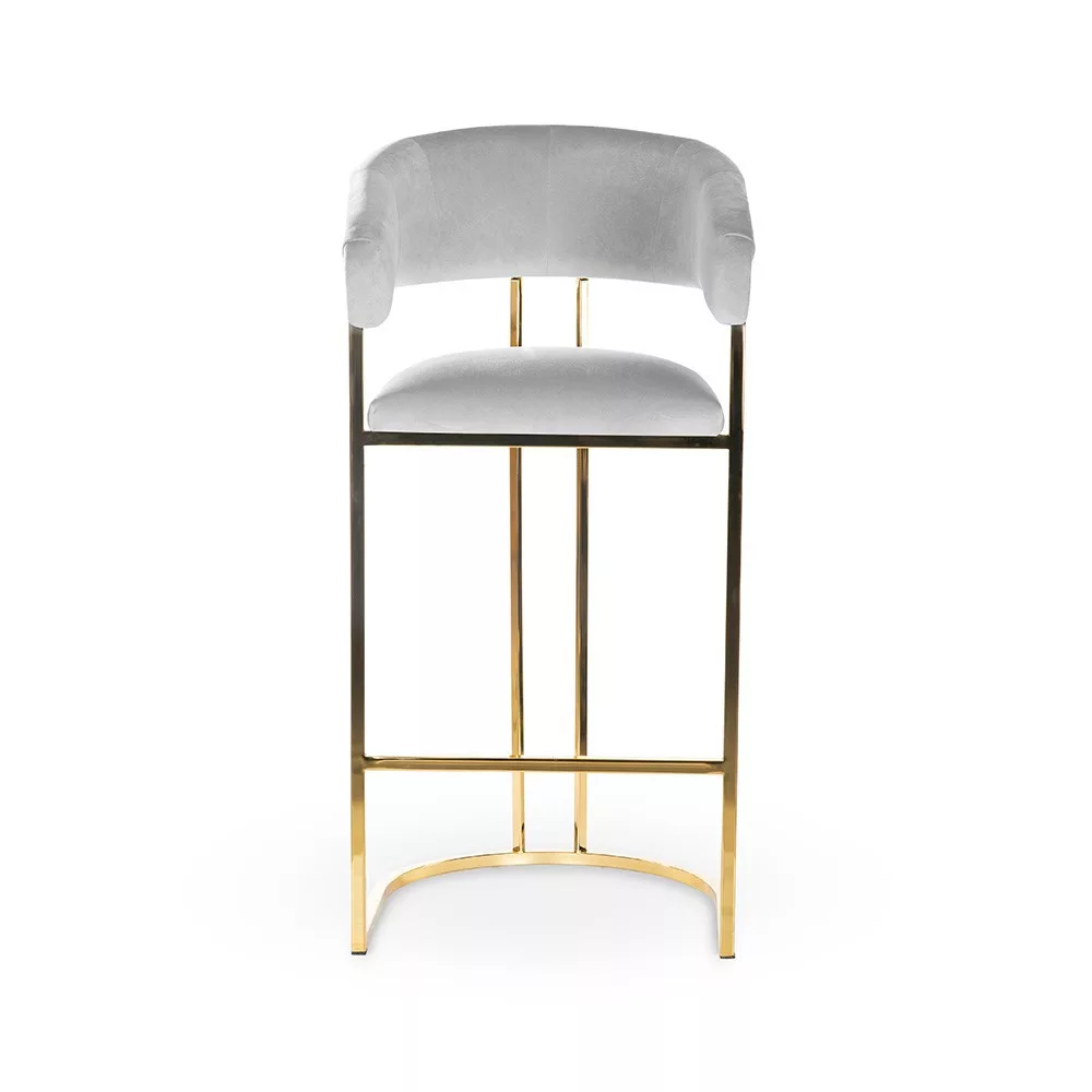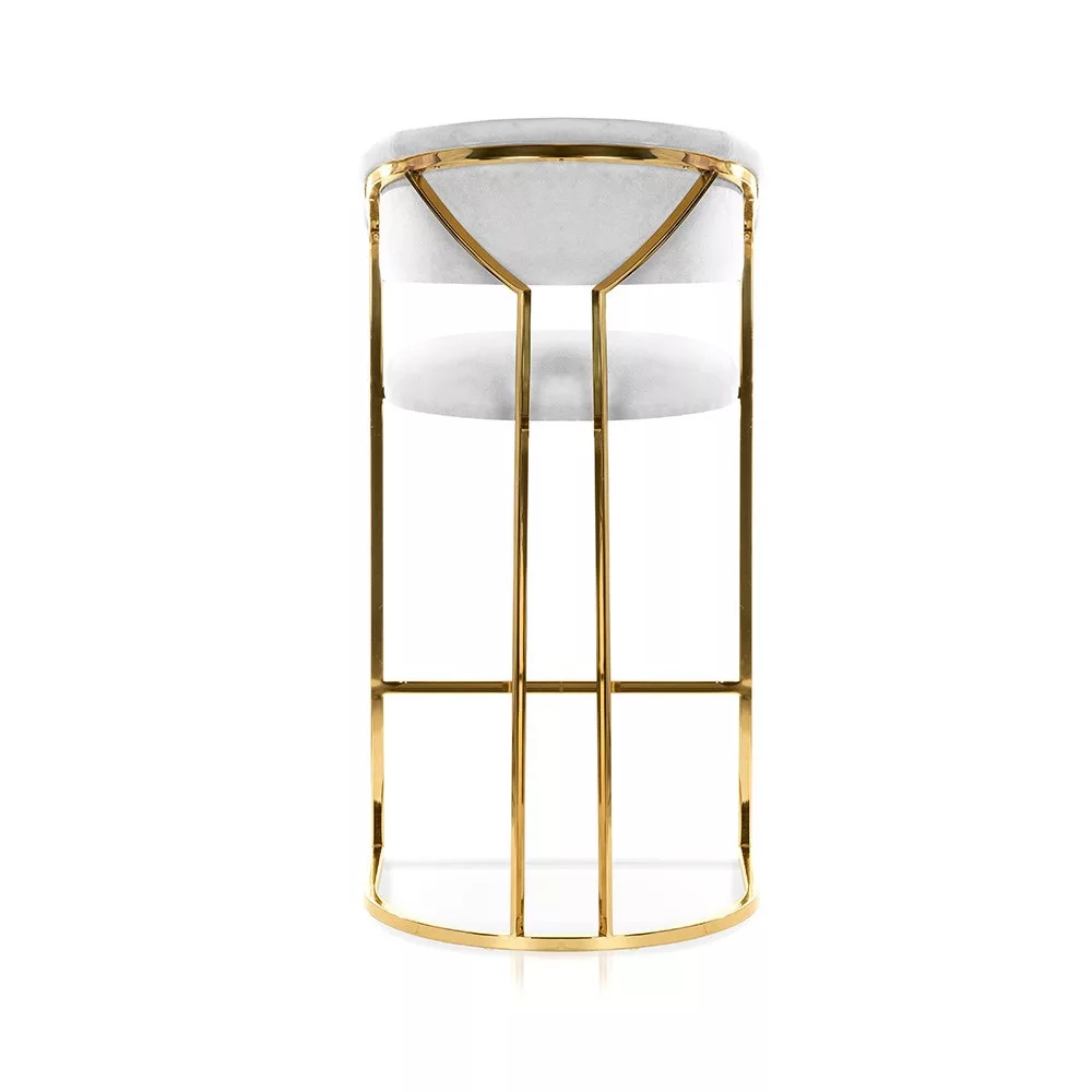 Elegáns, modern bárszék arany színű fém vázzal és puha, fehér kárpitozott üléssel. A 70 cm-es ülésmagasság és az ergonomikus kialakítás tökéletes kényelmet biztosít, míg a luxus kivitel bármely enteriőr dísze lehet.