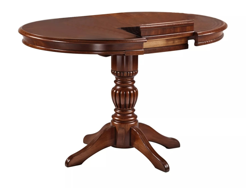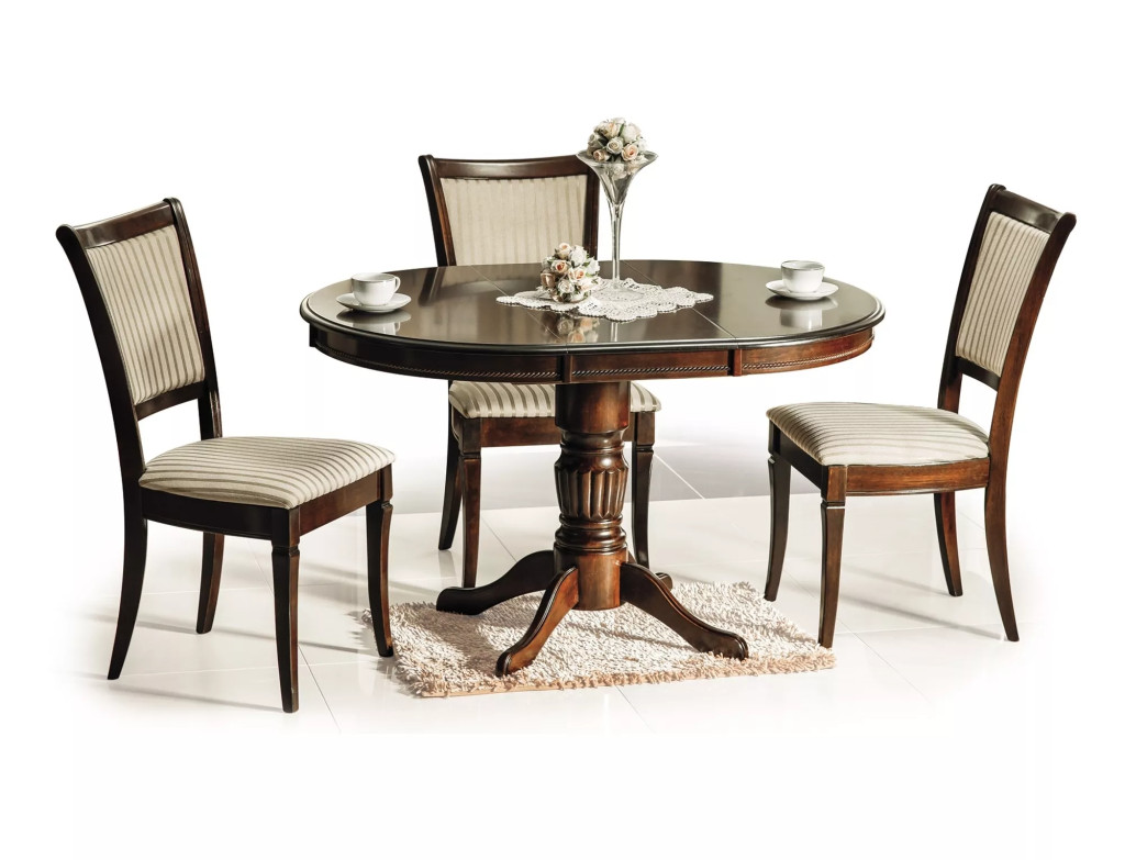 Elegáns, kinyitható kerek étkezőasztal diófa furnérral és masszív fakerettel. Tökéletes választás 6 személyes étkezésekhez, klasszikus stílusú enteriőrökbe.