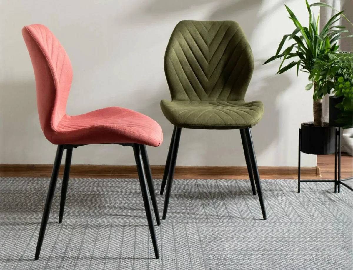 Modern étkezőszék Nea szövet kárpitozással, stílusos V-mintás háttámlával és tartós fekete matt fém vázzal. Tökéletes választás az étkezőbe vagy dolgozószobába.