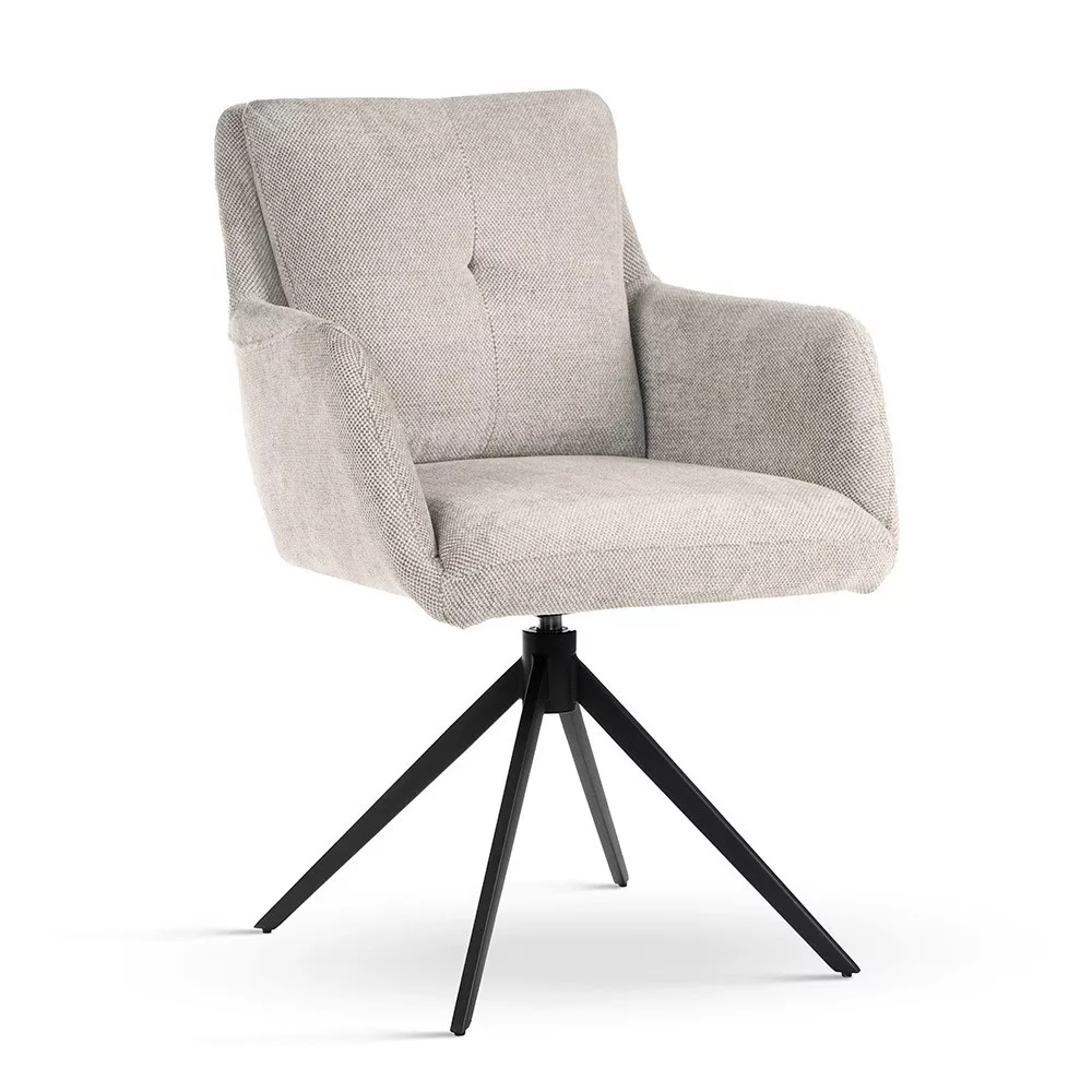 A Monica forgószék a modern design és a praktikus funkcionalitás tökéletes ötvözete. A szék bézs színű, puha kárpitozása kellemes tapintású és tartós anyagból készült. A fekete fém csillag alakú láb stabil alapot biztosít és harmonikusan illeszkedik a szék összképéhez. A háttámla ergonomikus kialakítása és a karfák extra kényelmet nyújtanak hosszabb használat esetén is.