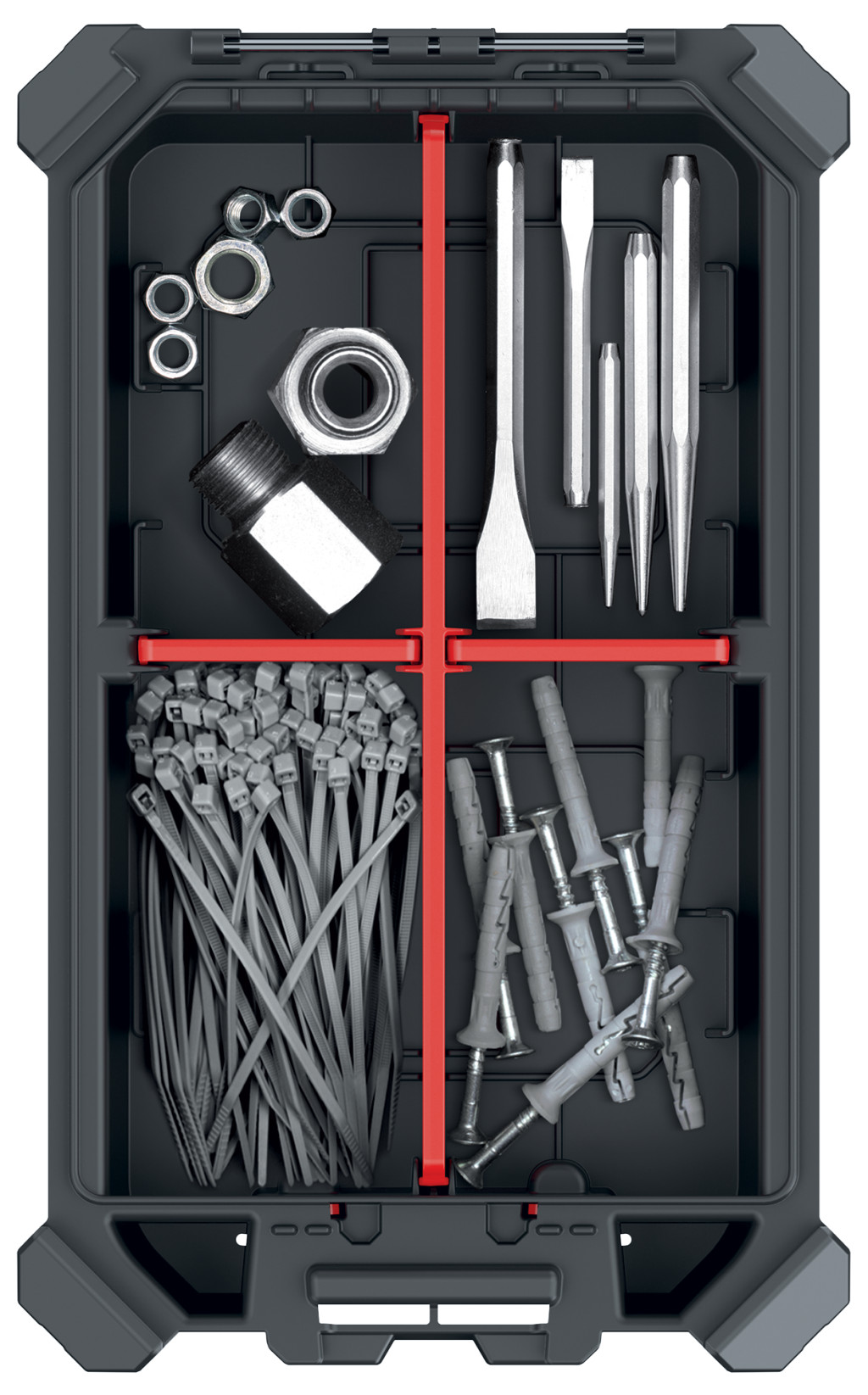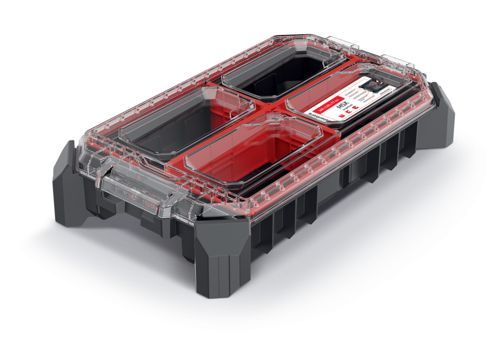 A három rekeszes kialakítás lehetővé teszi a szerszámok és alkatrészek rendszerezett tárolását. A moduláris rendszer kompatibilis az MSX, CMX és X BLOCK BRIDGE sorozatokkal, így rugalmasan bővíthető az igények szerint.