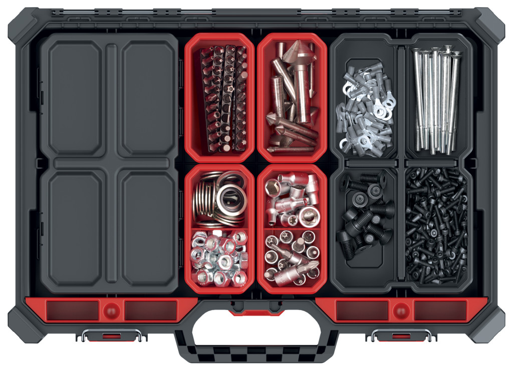 A rendező 7 kivehető tárolórekesszel és 3 állítható elválasztóval rendelkezik, amelyek testre szabható tárolási lehetőséget nyújtanak. Az ABS csatok és a fém zsanérok, valamint a beépített tömítés garantálja a por- és cseppálló védelmet.