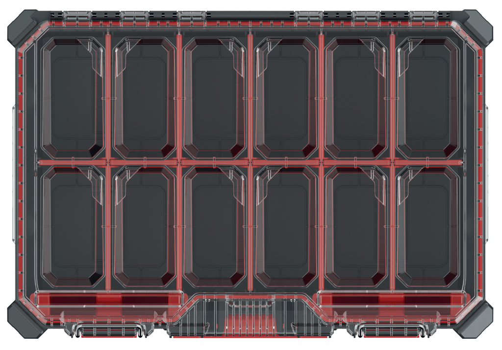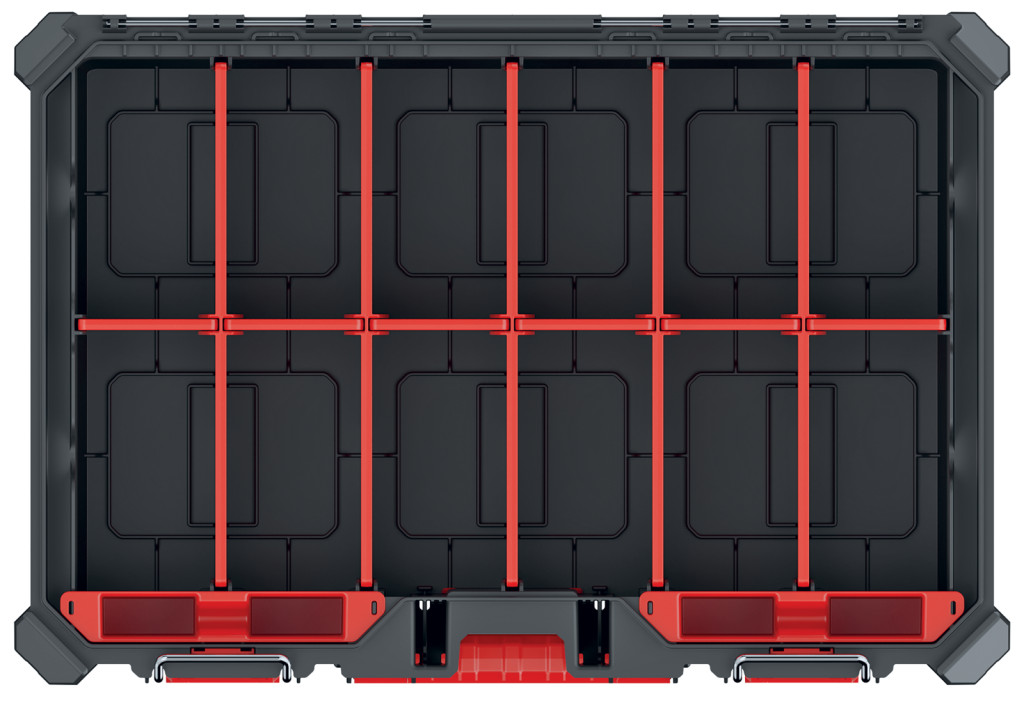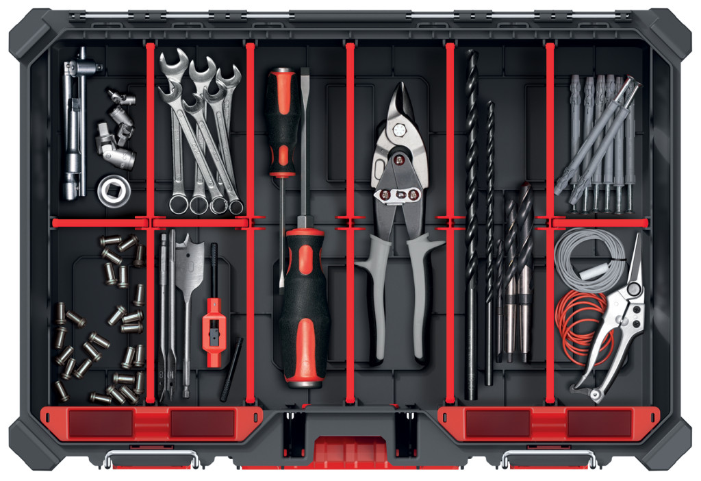 A rendszer 11 kivehető elválasztóval és 2 praktikus tárolópohárral rendelkezik, amelyek teljesen személyre szabható tárolóteret biztosítanak. A por- és vízálló tömítés, valamint az ABS és fém kombinációjából készült zárak maximális védelmet nyújtanak a tárolt eszközöknek.