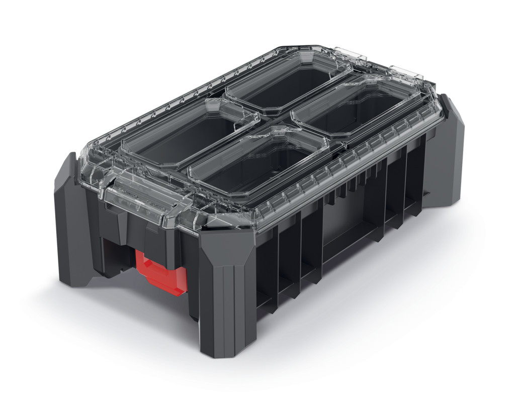 Professzionális szerszámrendező tároló kivehető elválasztókkal és tárolórekeszekkel, por- és vízálló kialakítással, kompatibilis a MSX rendszerrel.