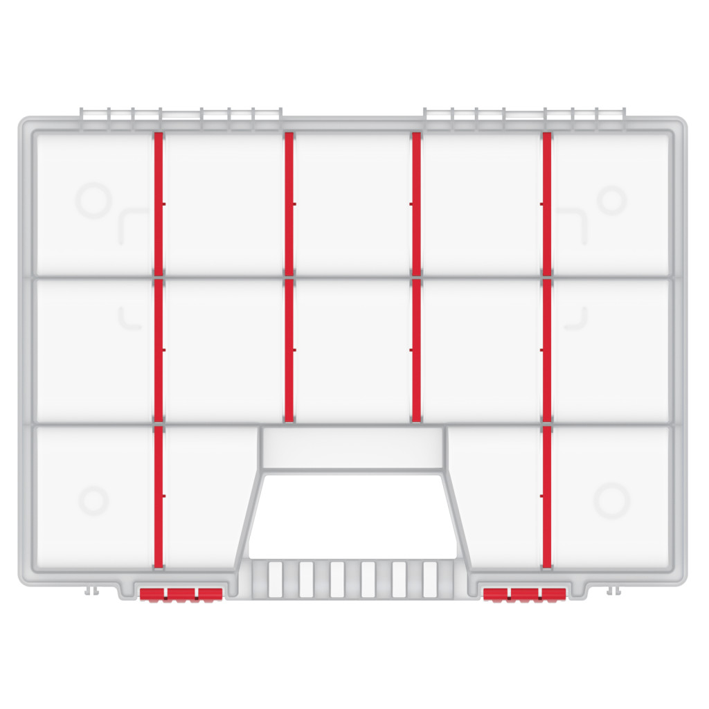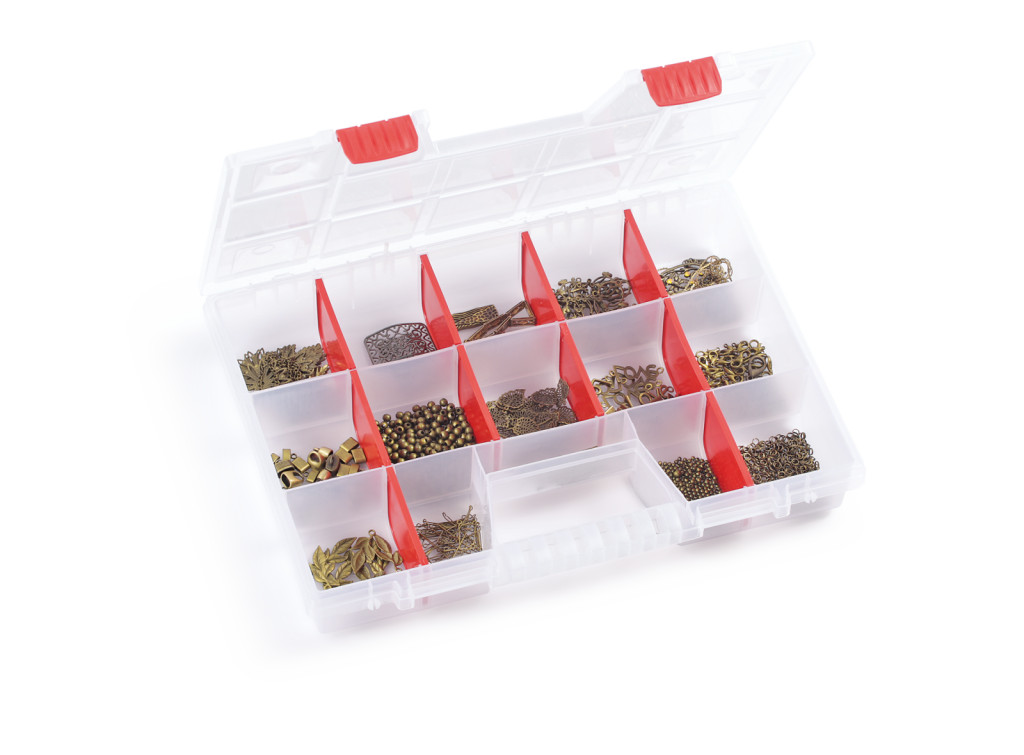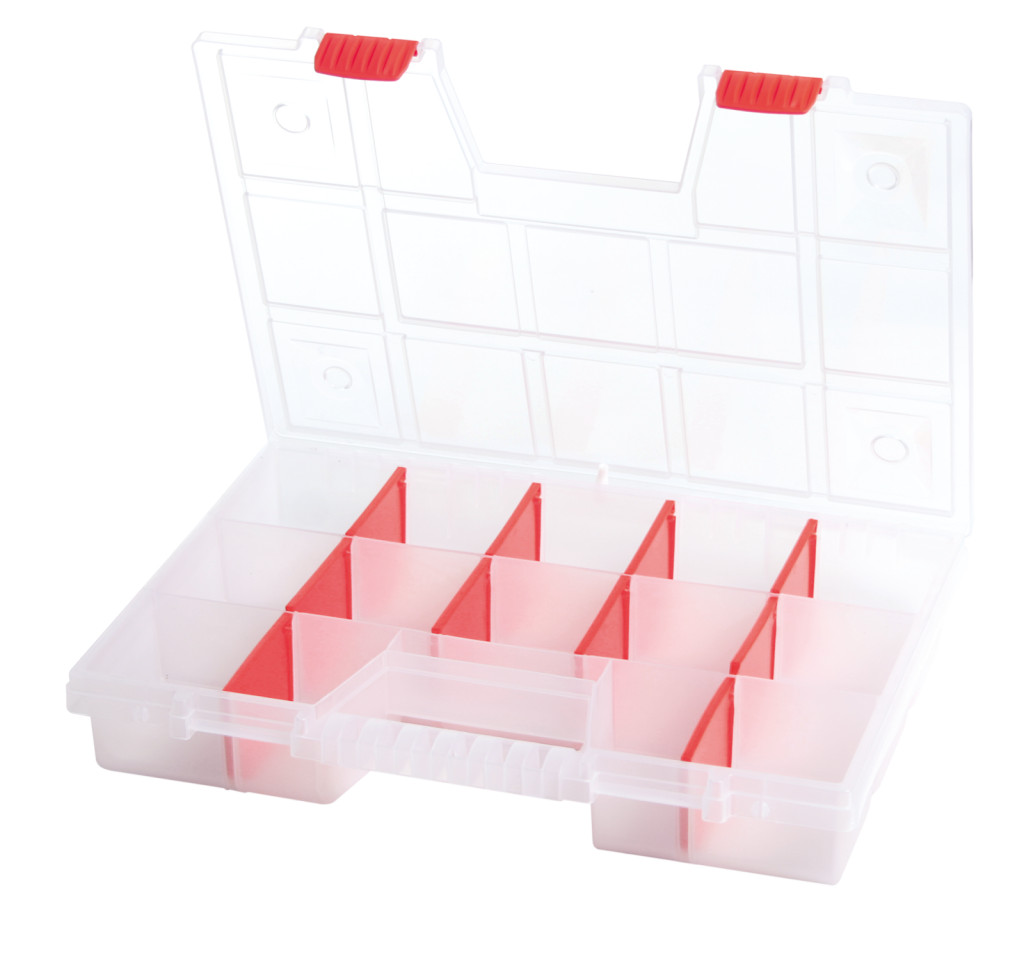 Praktikus, átlátszó szerszámrendező tároló ergonomikus fogantyúval és 10 kivehető rekesszel a hatékony eszközrendszerezéshez.