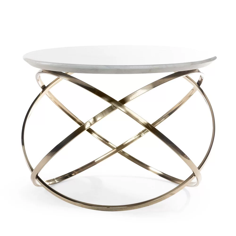 Elegáns ORBIS dohányzóasztal fehér márvány kompozit asztallappal és művészien hajlított arany fém lábszerkezettel. A modern dizájn és időtlen elegancia tökéletes kombinációja, amely bármely nappali központi díszévé válhat.