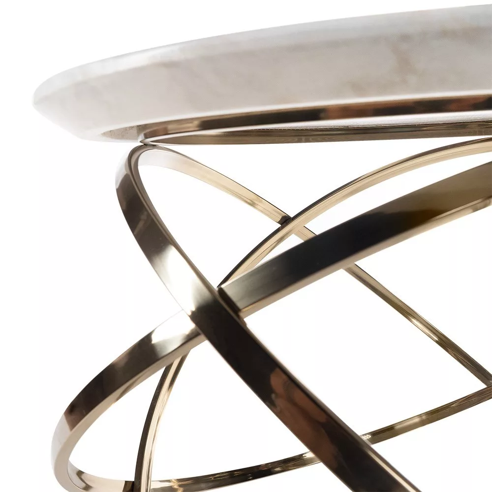 Az ORBIS dohányzóasztal a modern lakberendezés remekműve. A 70 cm átmérőjű fehér márvány hatású kompozit asztallap és az egyedi, keresztezett arany színű fém lábszerkezet tökéletes harmóniát alkot. A geometrikus forma és a prémium anyaghasználat együttesen teremti meg azt a különleges megjelenést, amely minden enteriőr ékessége lehet.