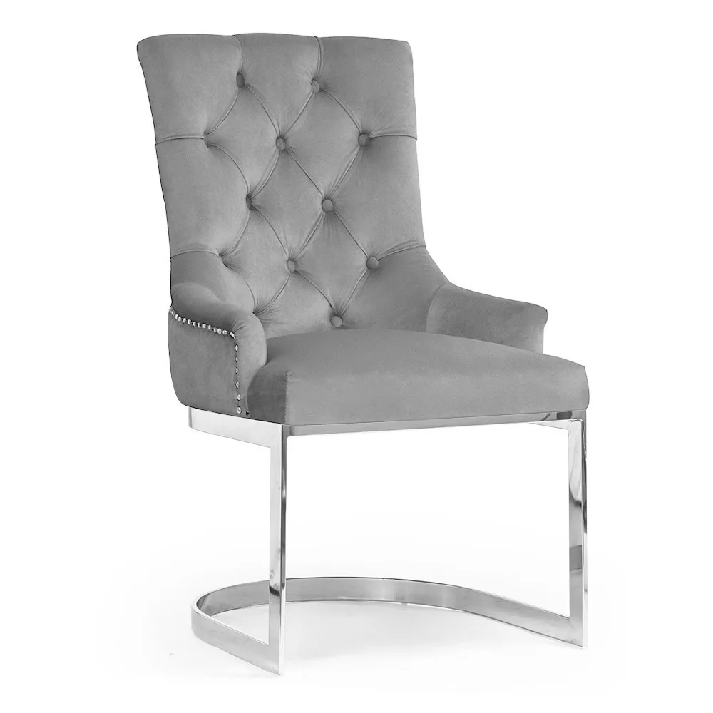 A Parma kárpitozott szék a modern luxus és időtlen elegancia megtestesítője. A szék puha, szürke bársony kárpitozása és a chesterfield stílusú, gombos háttámla különleges megjelenést kölcsönöz. Az arany színű, íves fém láb modern kontrasztot teremt, míg a szegecses díszítés további kifinomult részleteket ad a designhoz.