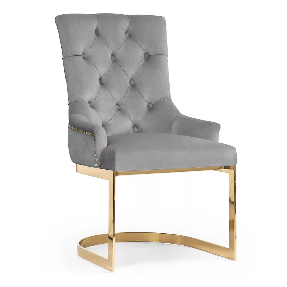 Elegáns Parma kárpitozott szék luxus szürke bársony kárpitozással és modern arany színű fém lábakkal. A chesterfield stílusú háttámla és a kényelmes ülőfelület tökéletes kombinációja a stílusnak és kényelemnek.