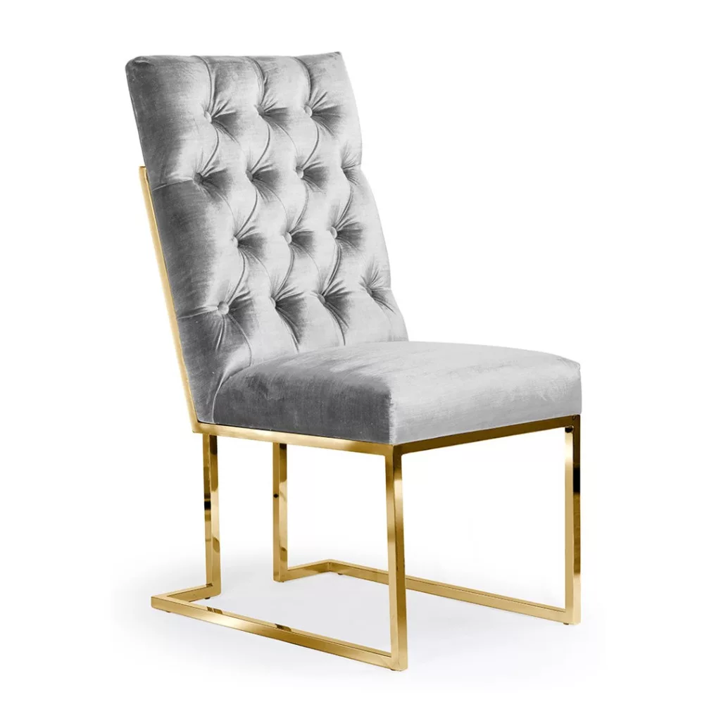 Luxus kialakítású Paul kárpitozott szék elegáns Chesterfield stílusú háttámlával és prémium minőségű szürke bársony kárpitozással. A króm váz és a tűzött háttámla tökéletes kombinációja modern eleganciát kölcsönöz ennek az időtlen darabnak.