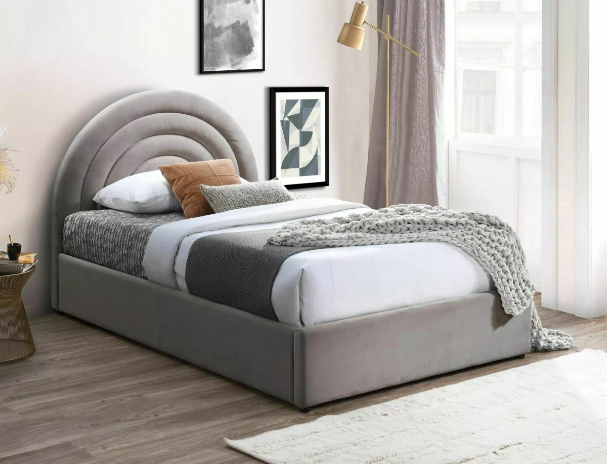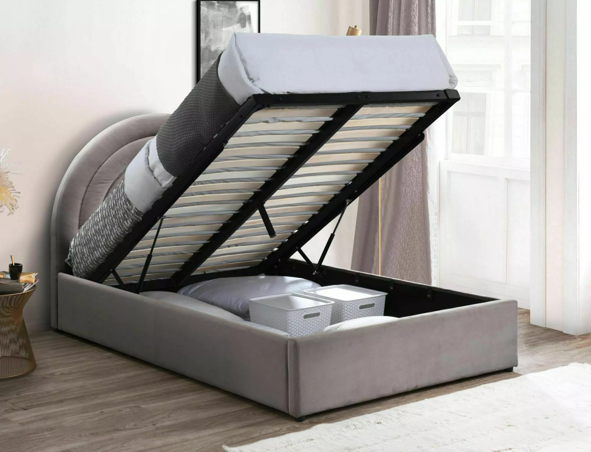 Elegáns bársony kárpitozású ágy beépített tárolóhellyel, modern ívelt fejtámlával. A gázrugós mechanizmusnak köszönhetően könnyedén hozzáférhet a tárolórekeszhez, míg a rugalmas lécezett ágyrács maximális kényelmet biztosít.