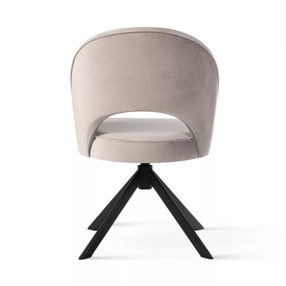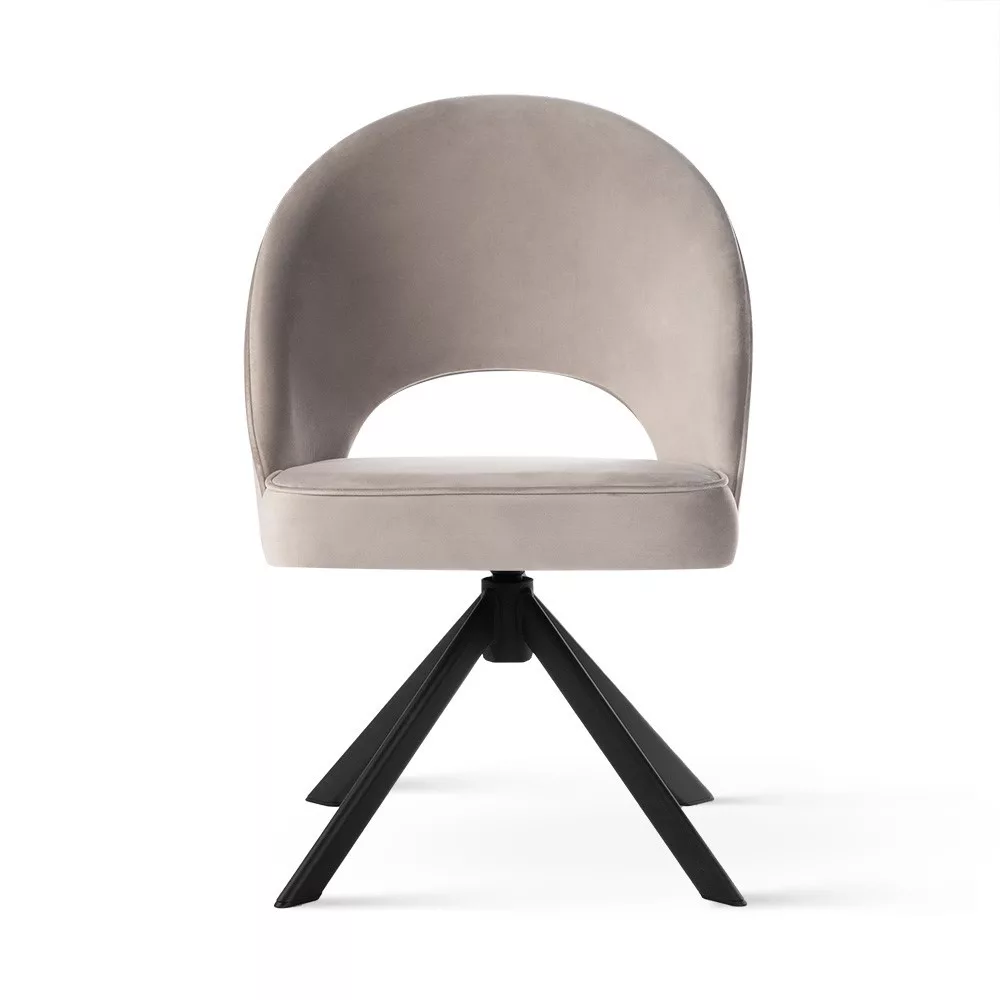 Modern és kényelmes forgó fotel puha bársony kárpitozással és stabil fekete fém lábakkal. Tökéletes választás dolgozószobákba vagy étkezőkbe, ahol a funkcionalitás találkozik az eleganciával.