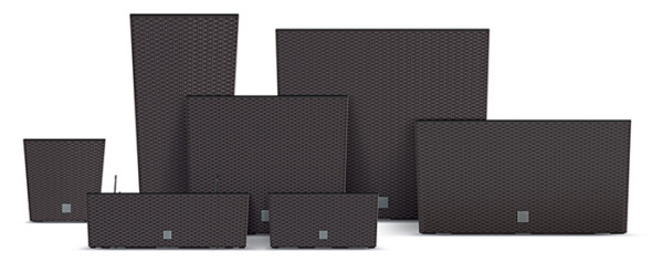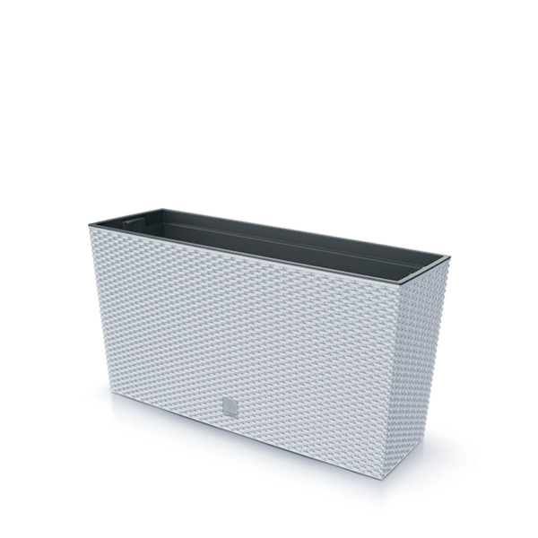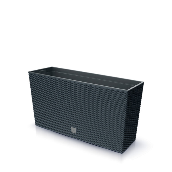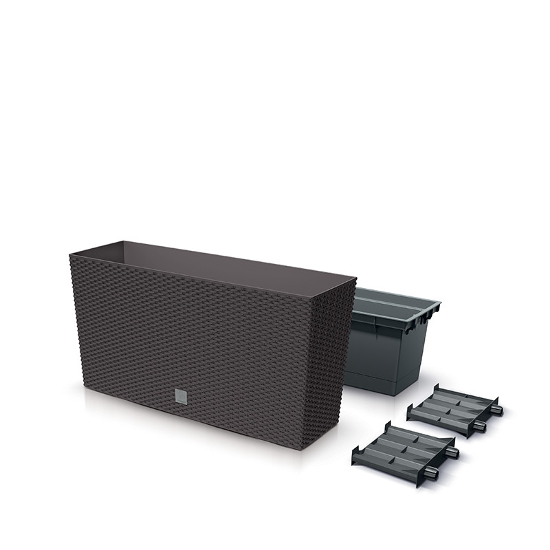 Modern, fonott mintázatú virágláda beépített öntözőrendszerrel és 72 literes űrtartalommal, amely tökéletes megoldást nyújt erkélyek és teraszok díszítésére.