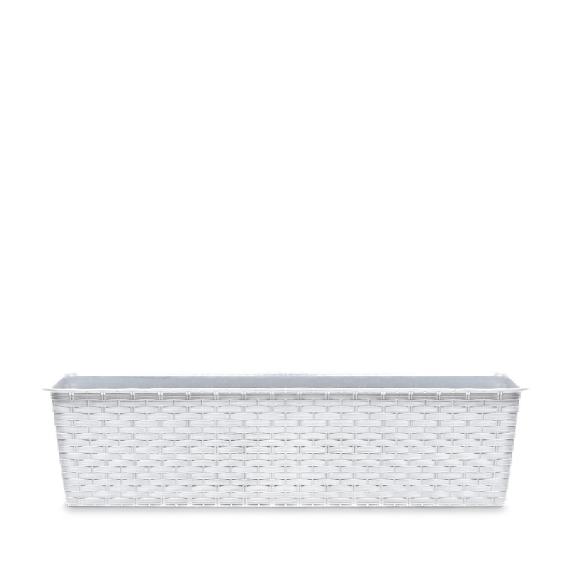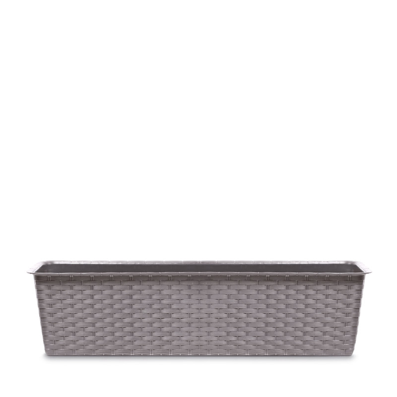 Elegáns, rattan hatású műanyag balkonláda 11,7 literes űrtartalommal, amely tökéletes választás erkélyek és teraszok díszítéséhez.
