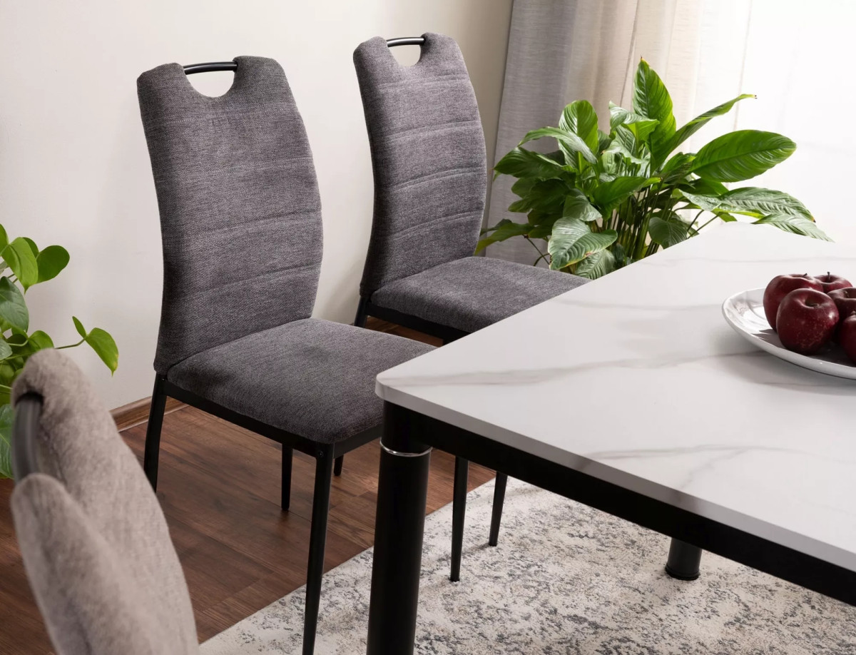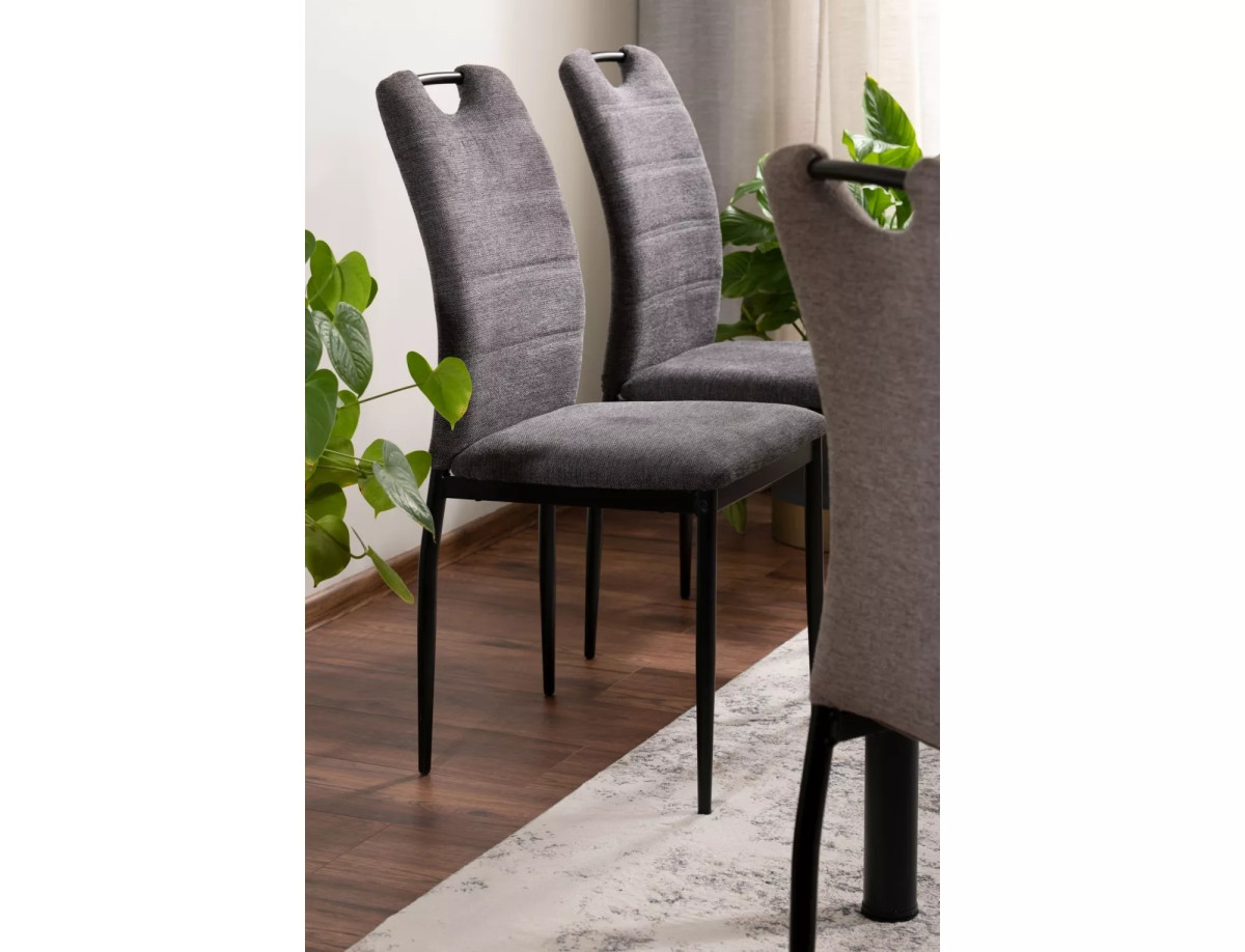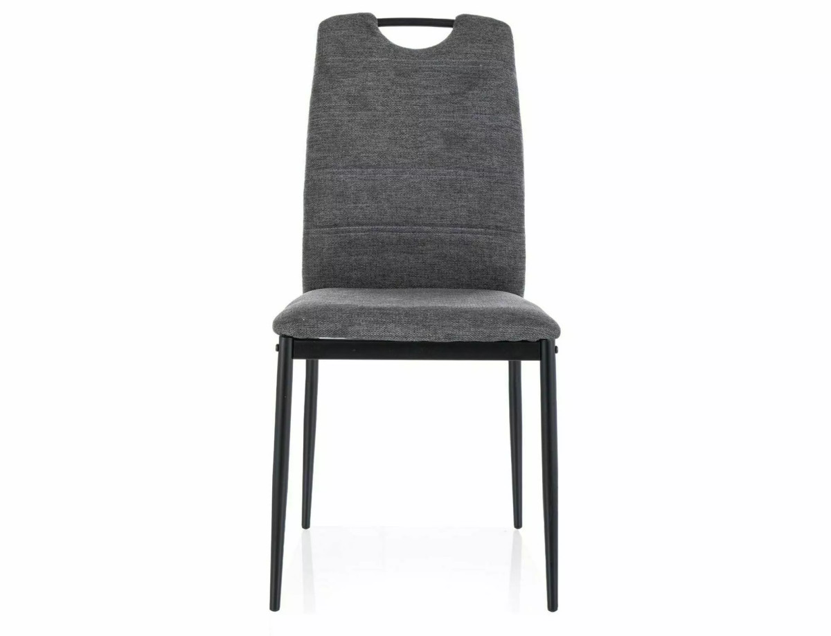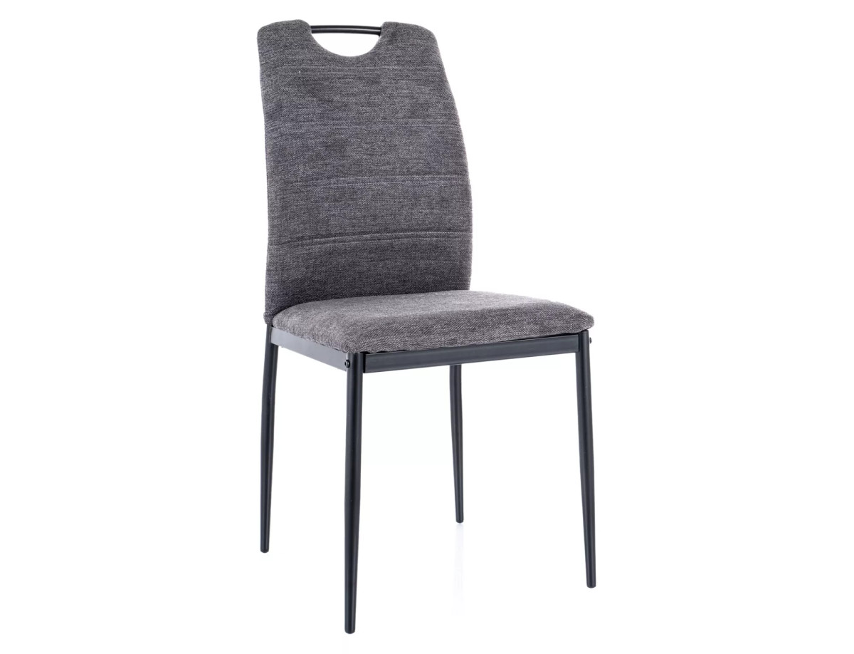 Modern étkezőszék kényelmes Brego szövet kárpitozással és matt fekete fém vázzal. A háttámla tetején praktikus fogantyúval rendelkezik a könnyű mozgathatóság érdekében.