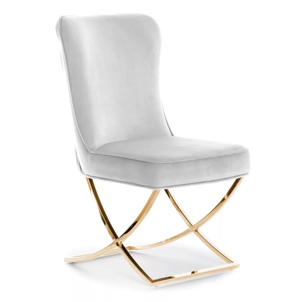 Elegáns kárpitozott szék puha párnázással és modern, X-alakú arany színű fém lábszerkezettel. Tökéletes választás azoknak, akik a luxust és a kényelmet egyaránt nagyra értékelik.