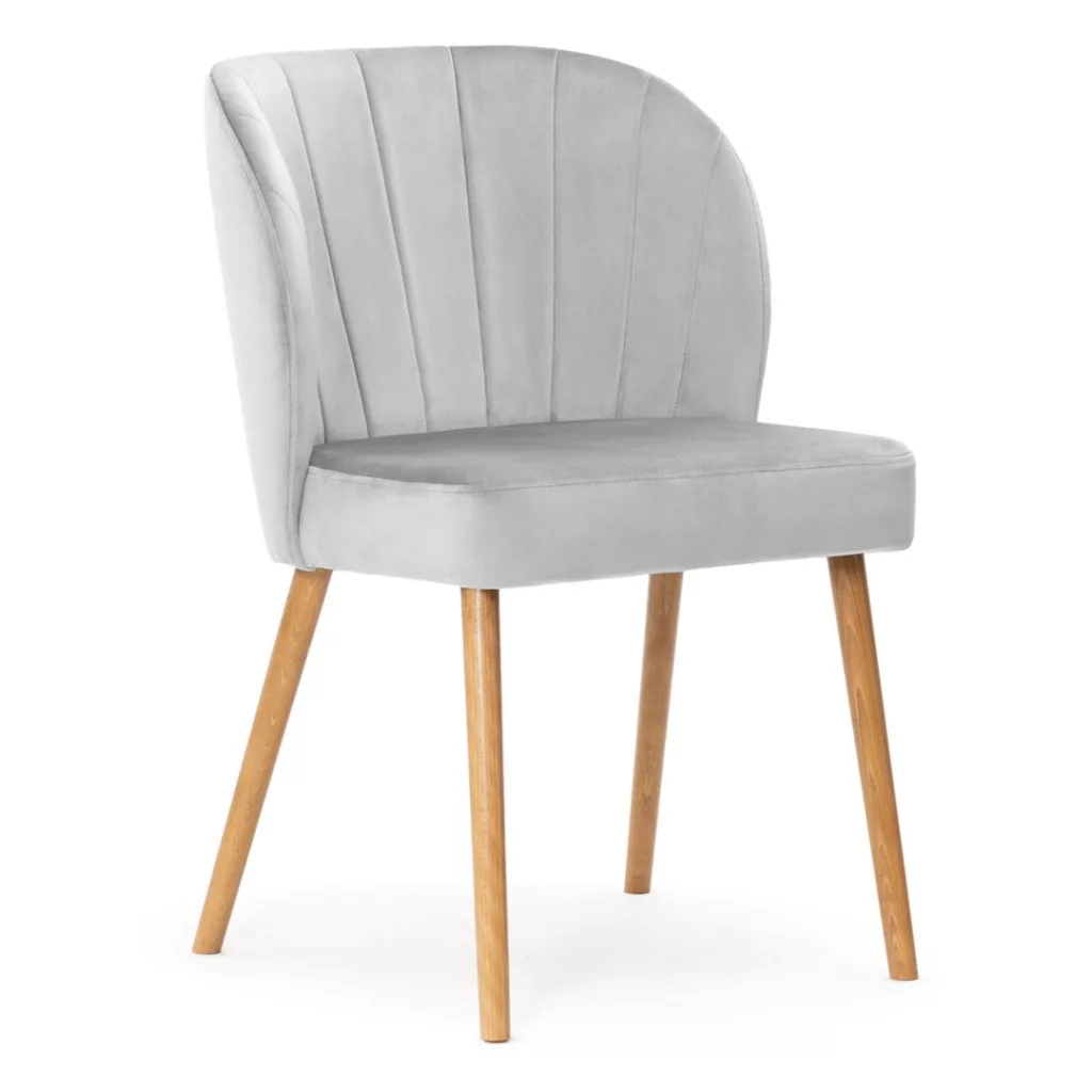 Elegáns kagyló formájú kárpitozott szék puha szürke bársony kárpitozással és stílusos fa lábakkal. Tökéletes választás étkezőbe vagy dolgozószobába, ahol a kényelem és a modern design találkozik.