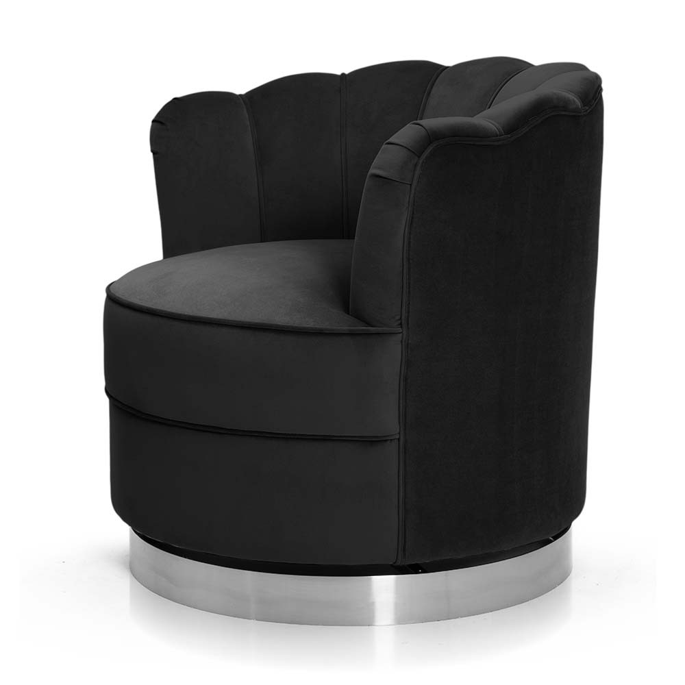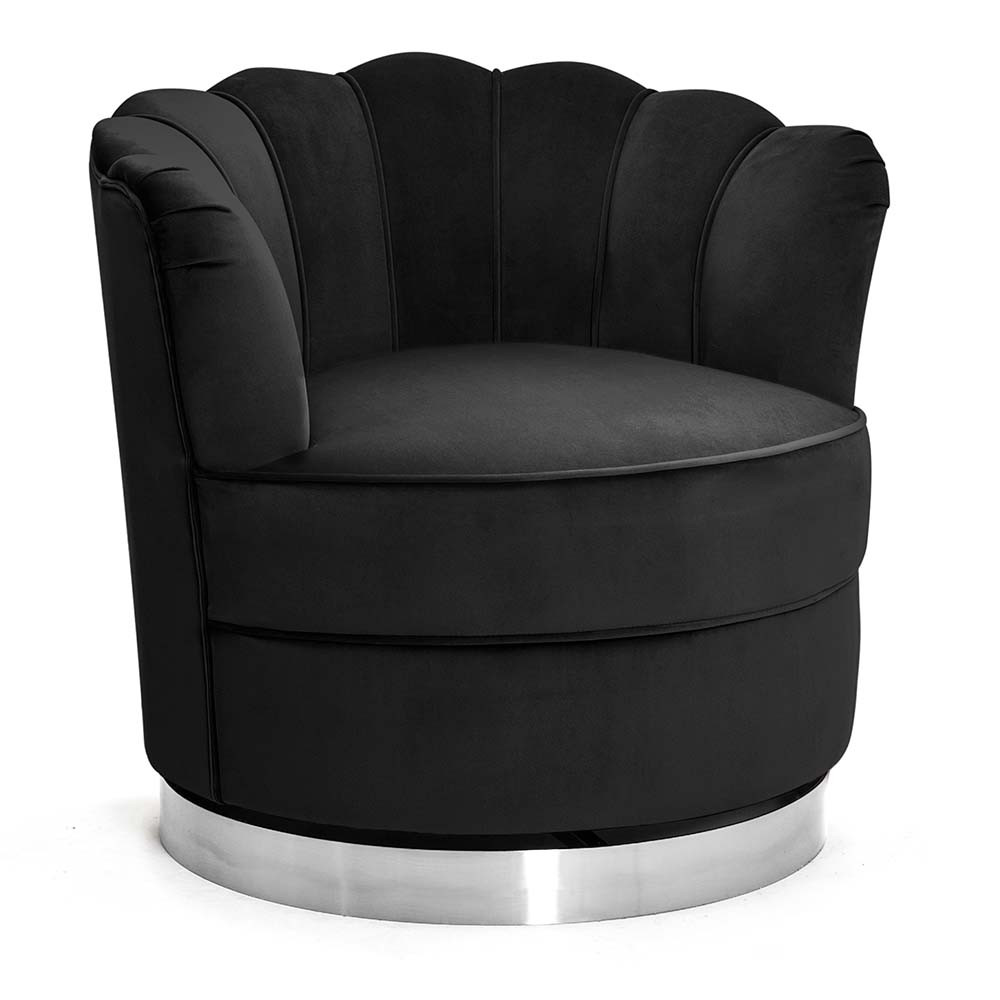 Elegáns kagyló formájú forgófotel fekete kárpitozással és ezüst színű fém alappal. A 360 fokos forgómechanizmus és a kényelmes habszivacs ülés tökéletes kombinációja a stílusnak és funkcionalitásnak.