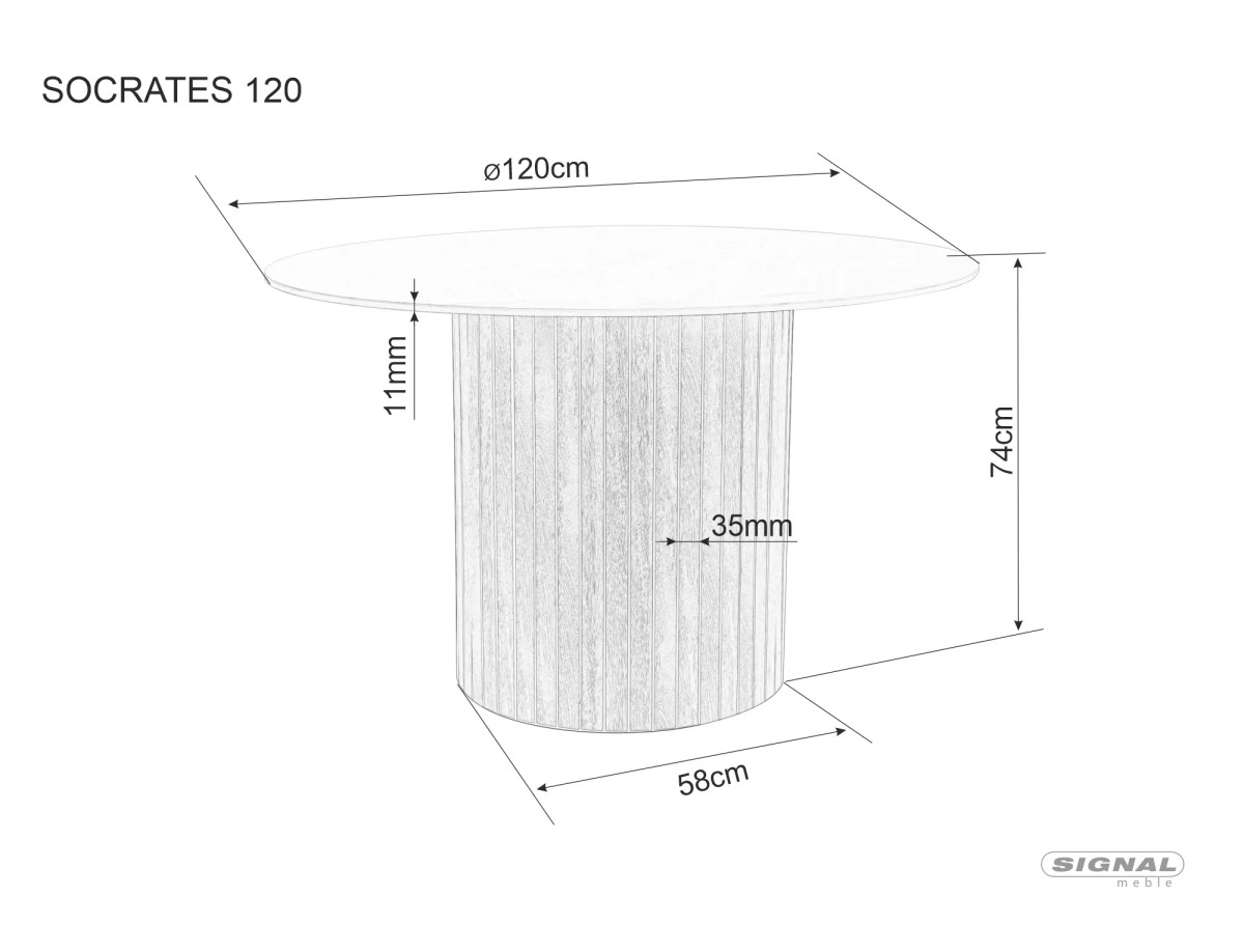 A Socrates étkezőasztal egy lenyűgöző bútordarab, amely ötvözi a modern dizájnt és a funkcionalitást. A 120 cm átmérőjű kerek asztallap kiváló minőségű fehér fényes kerámiából készült, míg a különleges, bordázott lábazat artisan tölgy MDF-ből. Az asztal 76 cm magas, és kényelmesen elfér körülötte akár 7 személy is.