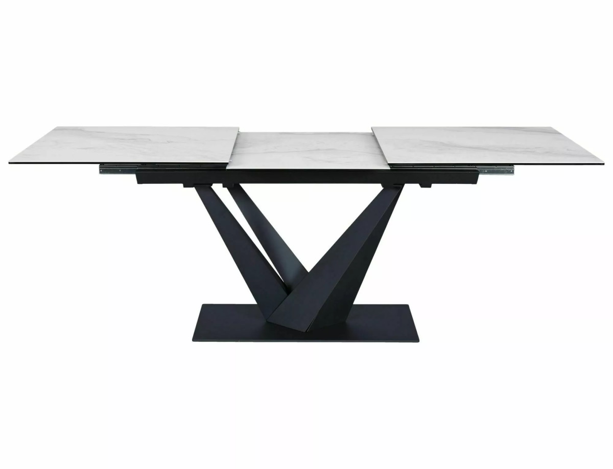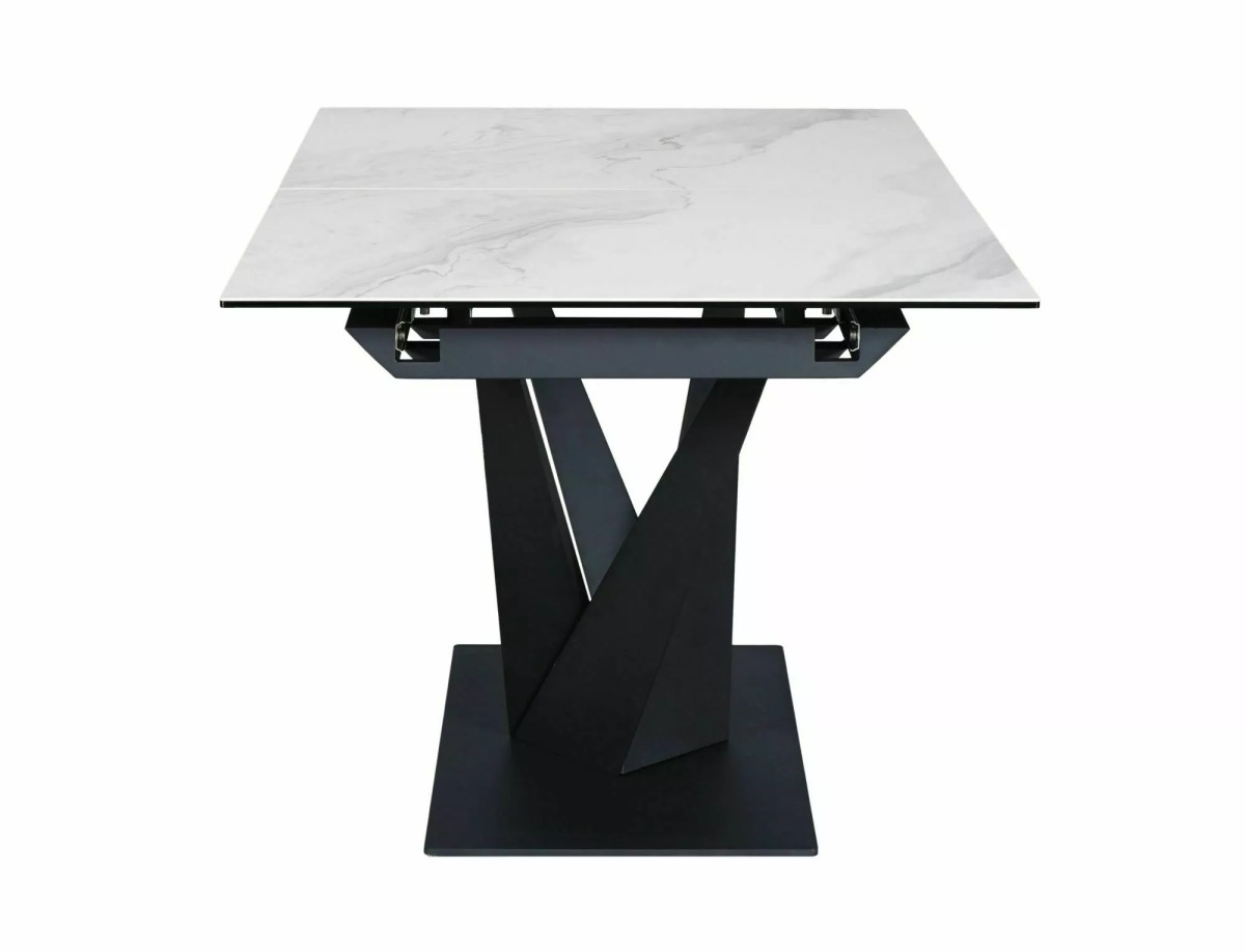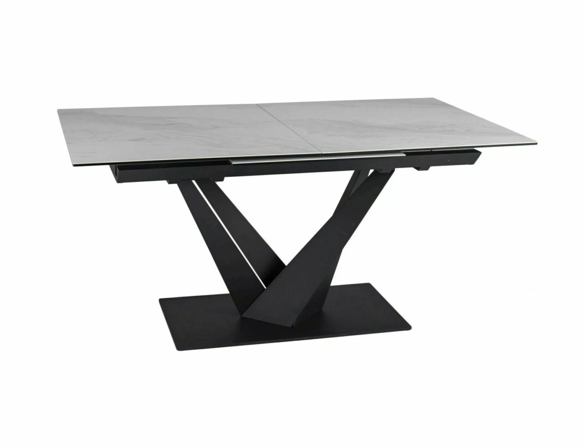 Modern, bővíthető étkezőasztal edzett üveg és kerámia lappal, amely tökéletesen ötvözi az elegáns megjelenést a praktikussággal. A matt fehér asztallap és a matt fekete fém váz kombinációja időtlen dizájnt kölcsönöz.