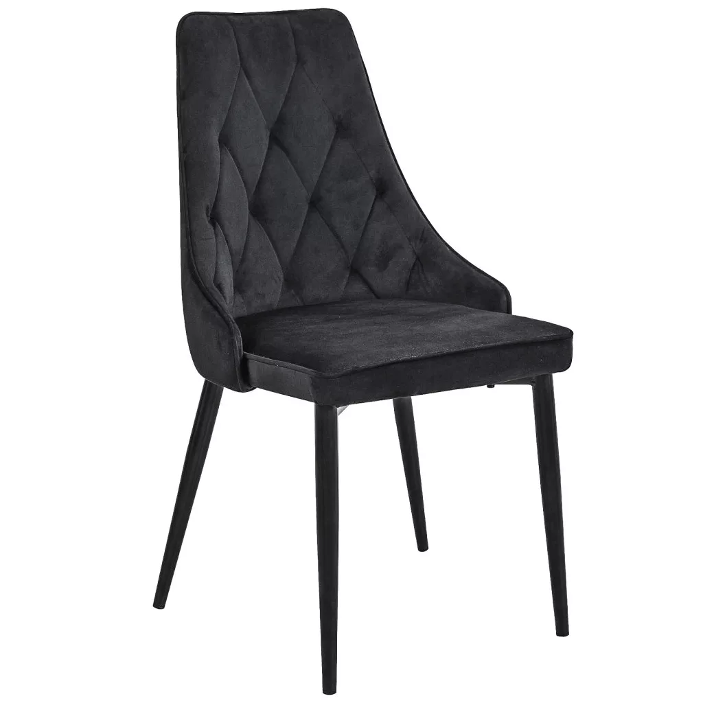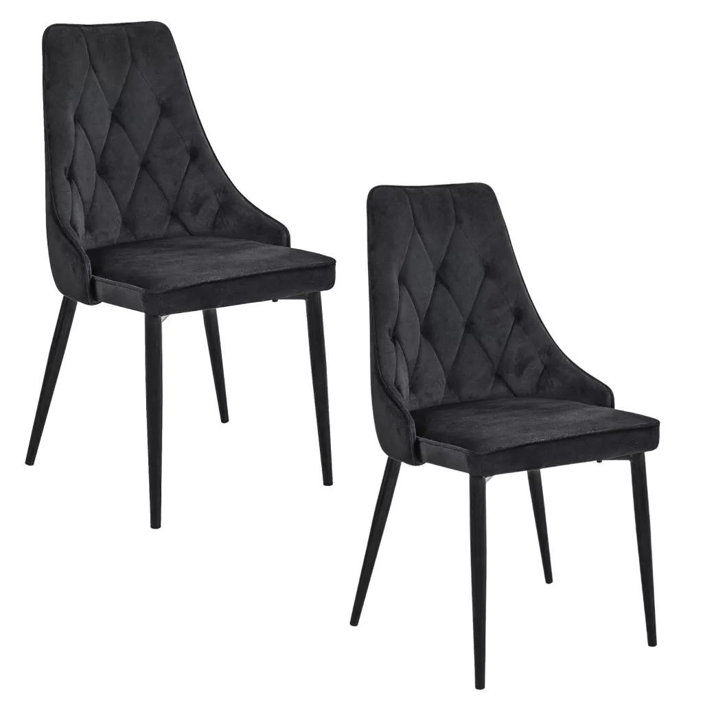 Elegáns, steppelt kárpitozású étkezőszék páros fekete bársony huzattal és fém lábakkal. Modern és időtlen dizájn, amely tökéletesen ötvözi a kényelmet és a stílust.