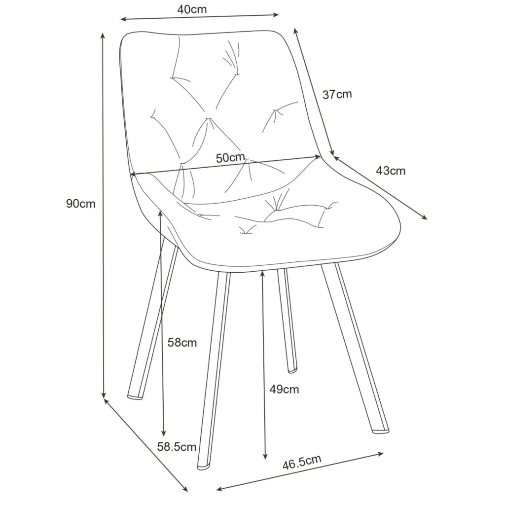 Elegáns, steppelt kárpitozású étkezőszék készlet fekete bársony huzattal és fekete acél lábakkal. A modern és időtlen dizájn tökéletes választás étkezőbe vagy nappaliba.