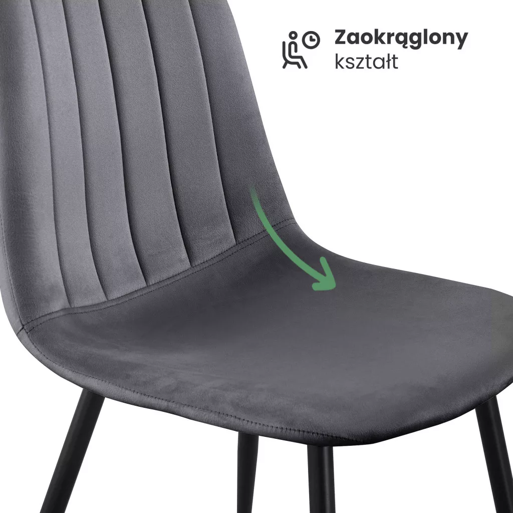 Elegáns, welur kárpitozott LUMO szék sötét grafit színben, fekete acél lábakkal. A puha, függőleges varrásokkal díszített támlája és kényelmes ülőfelülete tökéletes választás modern és minimalista enteriőrökhöz.