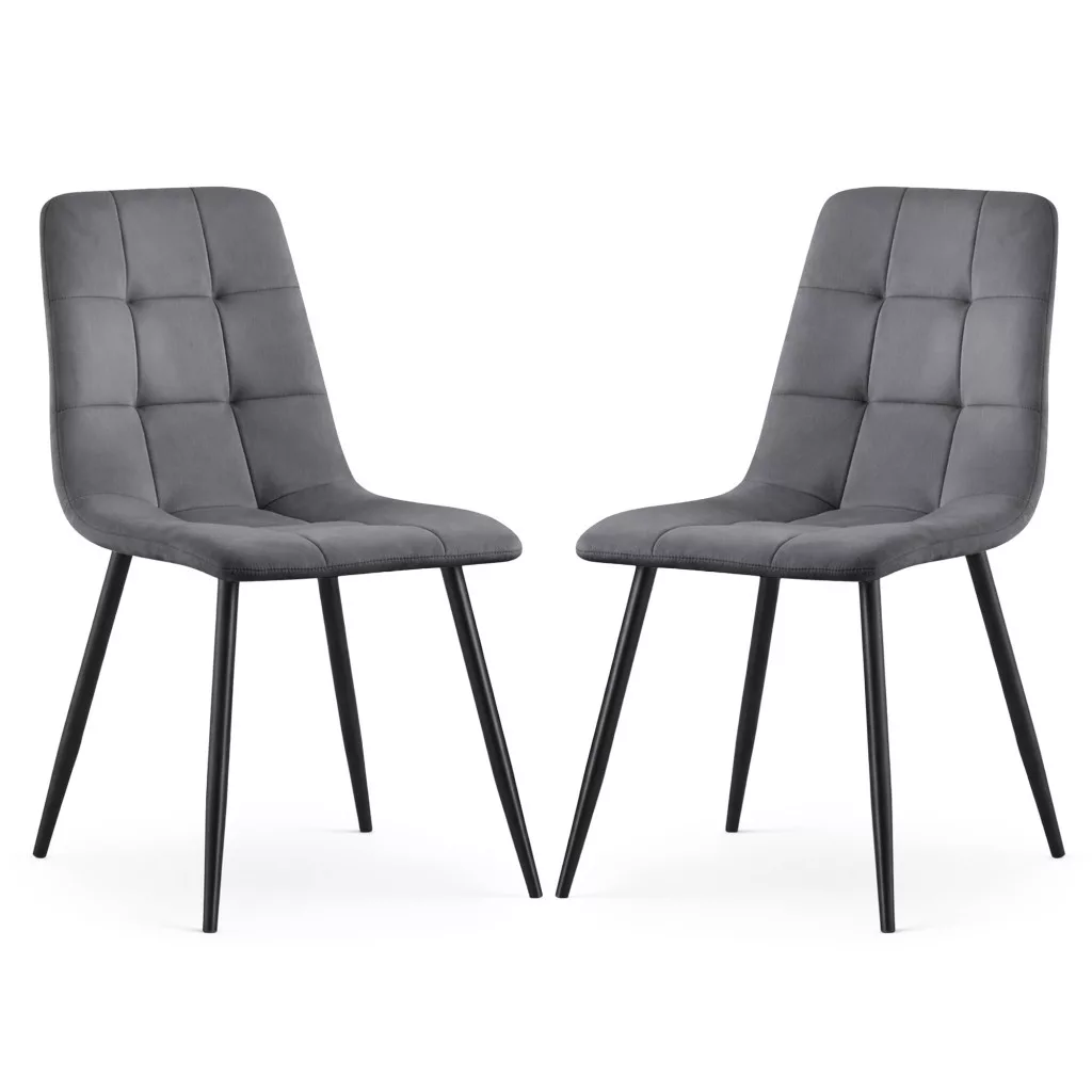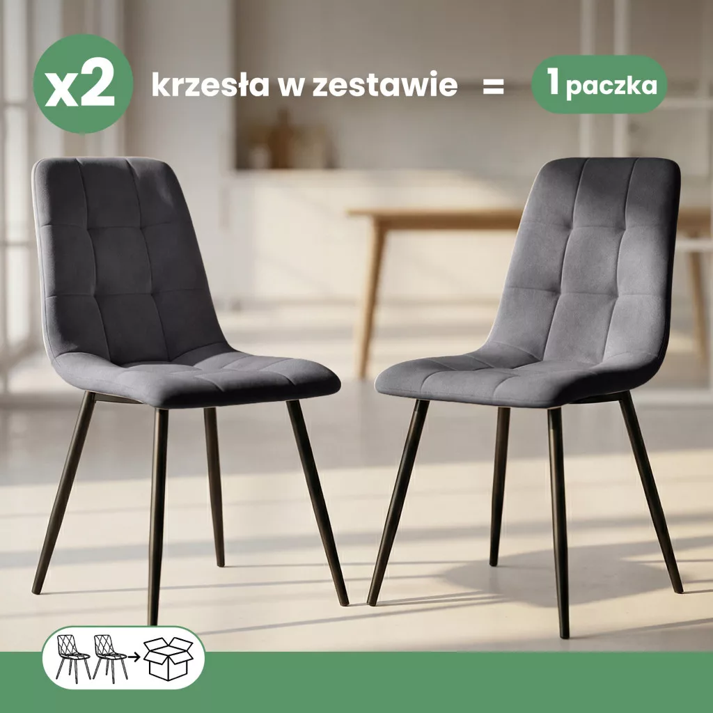 Elegáns, kockás steppelt welúr étkezőszék fekete fém lábakkal, amely tökéletesen illeszkedik modern, loft és skandináv stílusú enteriőrökbe. A 2 darabos szett praktikus és stílusos megoldást kínál kisebb étkező terekhez is.