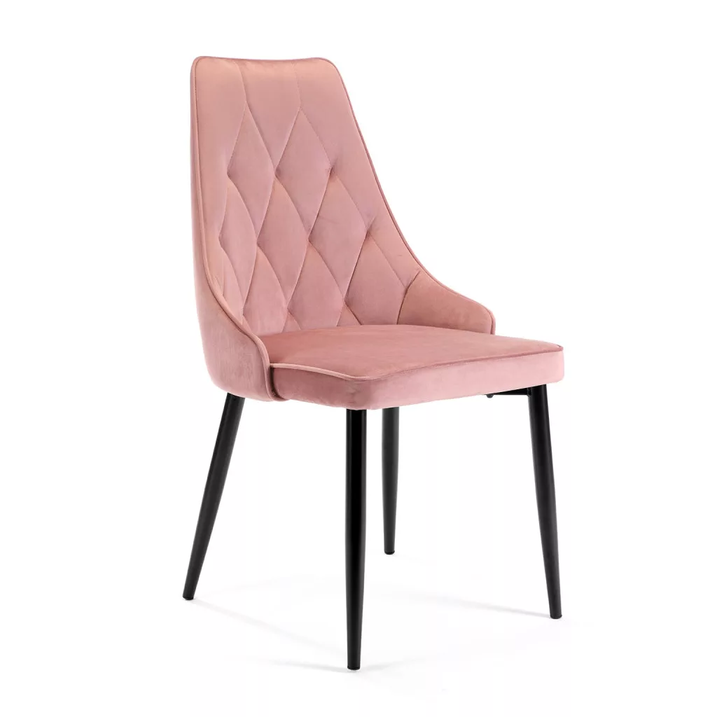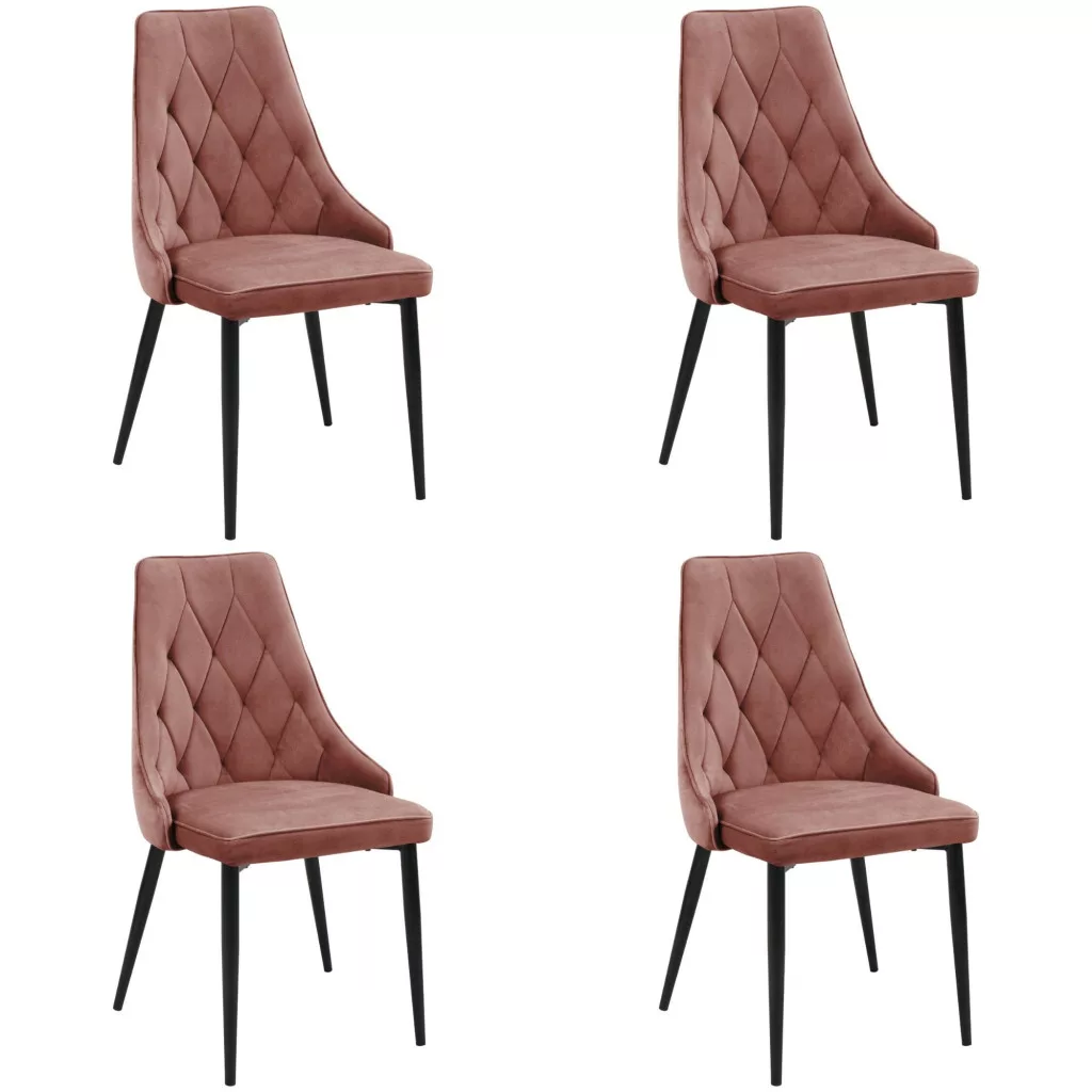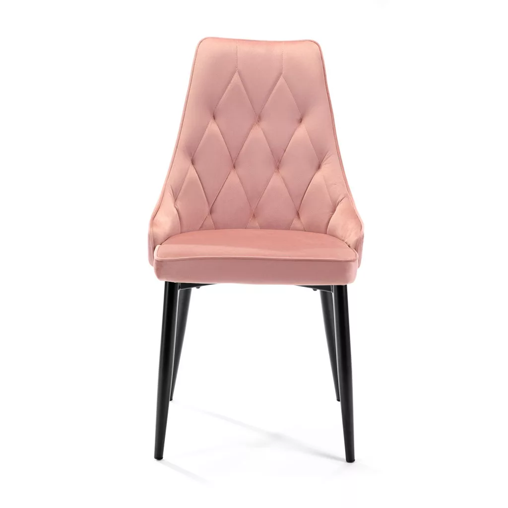 Elegáns, steppelt kárpitozású glamour étkezőszék rózsaszín bársonnyal és fekete fémlábakkal. A szett 4 darab kényelmes, modern dizájnú széket tartalmaz, amelyek tökéletesen illenek mind klasszikus, mind kortárs enteriőrökbe.