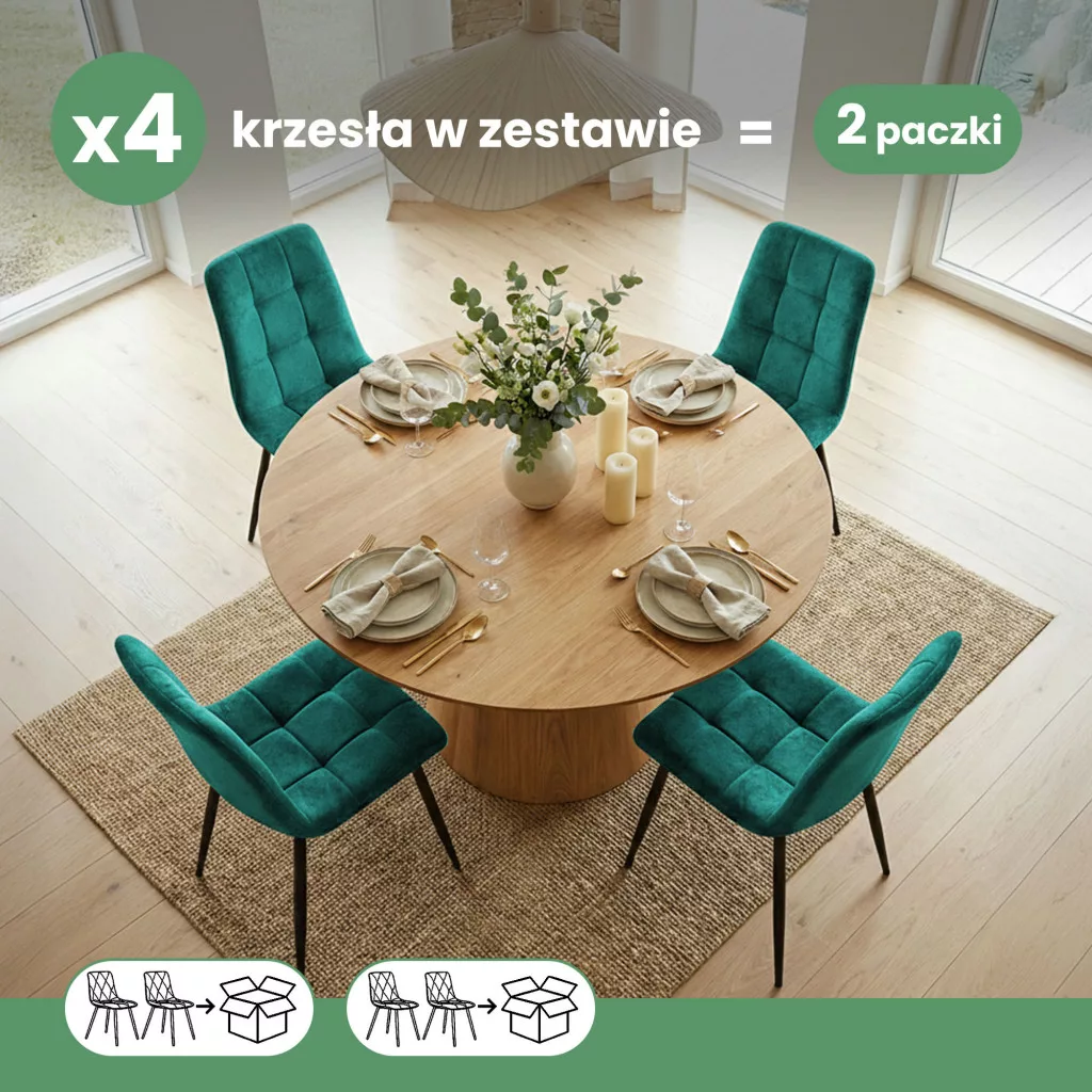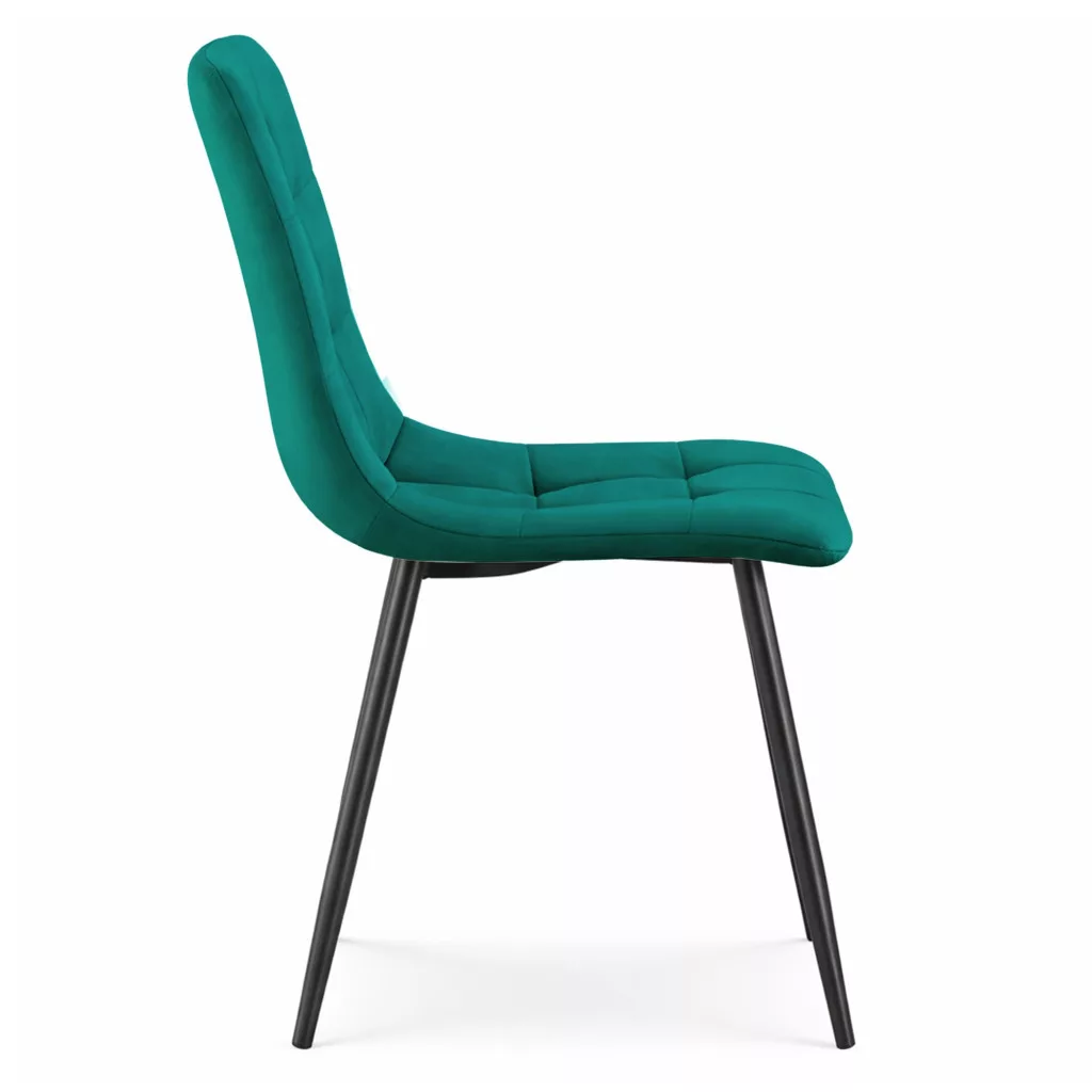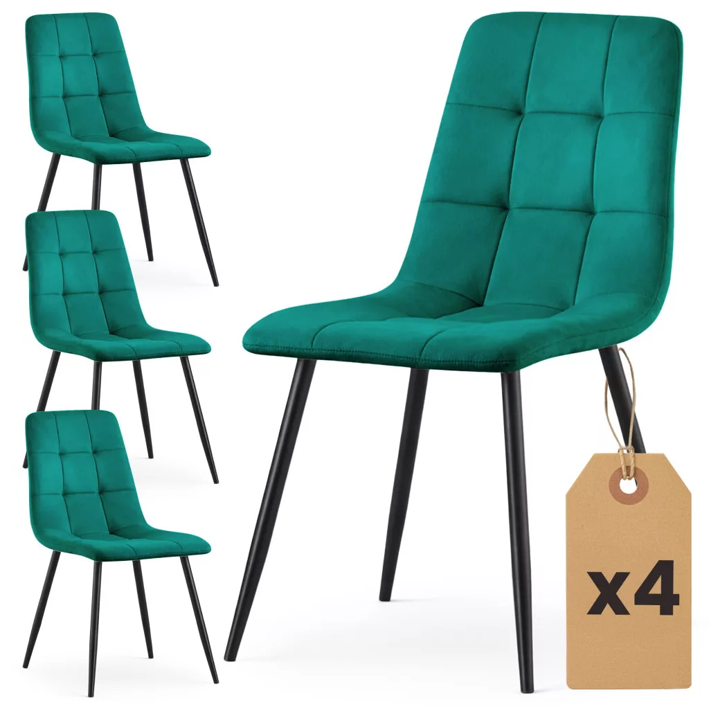 Elegáns, négyzetes steppelt welúr kárpittal és karcsú fekete fém lábakkal készült NERO étkezőszék 4 db-os szettben. Tökéletes választás modern, loft, skandináv és minimalista stílusú étkező berendezéséhez.