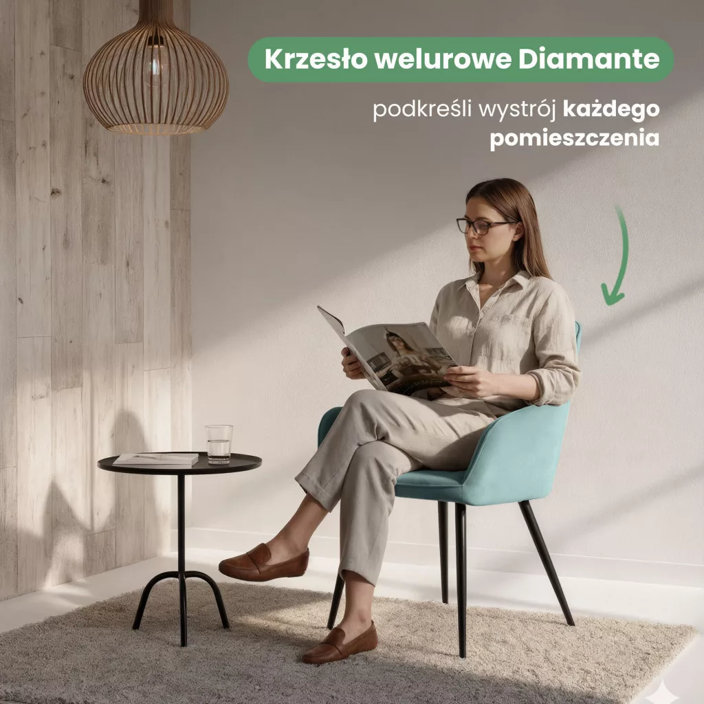 A DIAMANTE kárpitozott szék tökéletes választás azok számára, akik az eleganciát és a kényelmet egyaránt fontosnak tartják. A puha tapintású welur kárpit gyönyörű türkiz színben pompázik, míg a dekoratív steppelt mintázat különleges karaktert kölcsönöz a bútoroknak. A nagy sűrűségű habszivacs töltet hosszú órákon át tartó kényelmet garantál, így akár hosszabb vacsorák vagy családi összejövetelek alkalmával is kellemes marad az ülés.