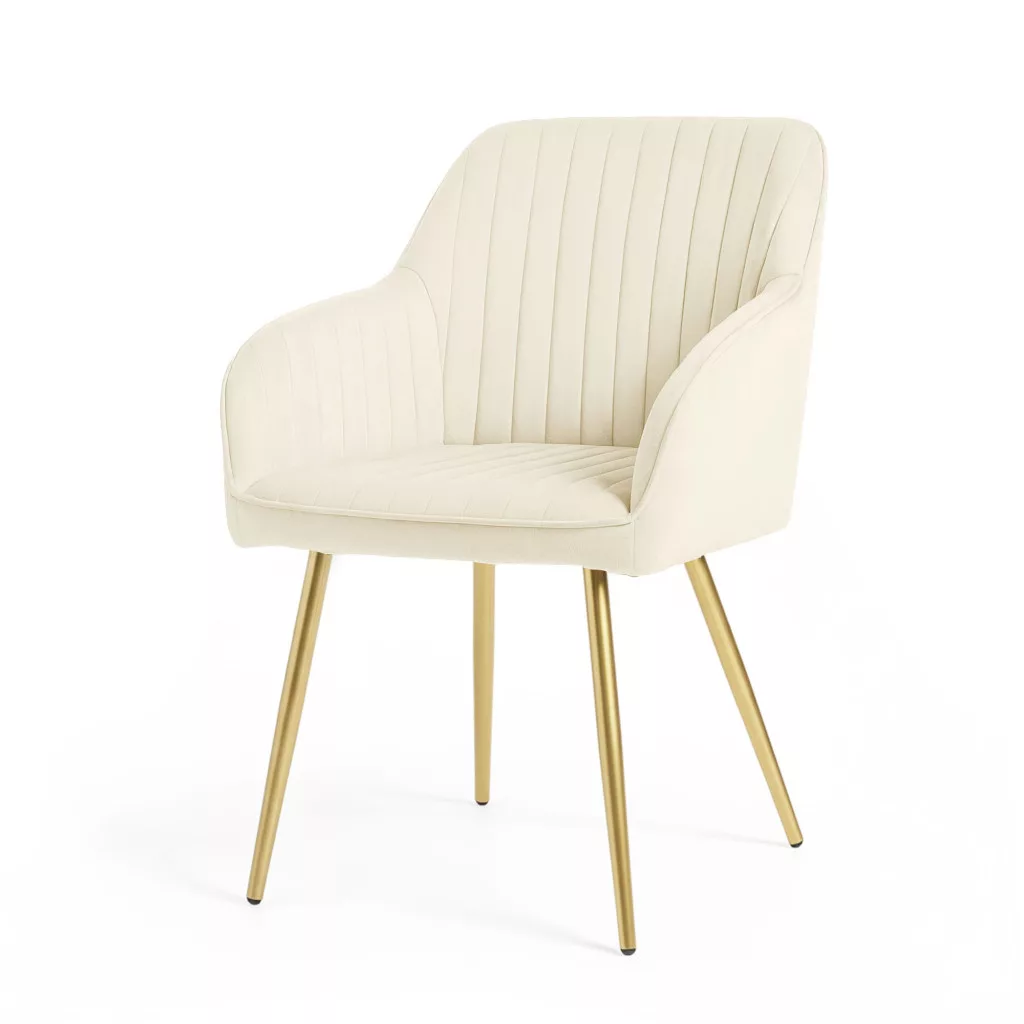 A Florence welúr szék tökéletes választás azok számára, akik az eleganciát és a kényelmet egyaránt fontosnak tartják otthonukban. A függőleges steppelt varrás finom textúrát ad a krém színű welúr kárpitnak, míg az arany színű acél lábak glamour eleganciát kölcsönöznek a bútor egészének. Ez a 6 darabos szett ideális megoldás modern, soft modern vagy glamour stílusú étkező berendezéséhez.