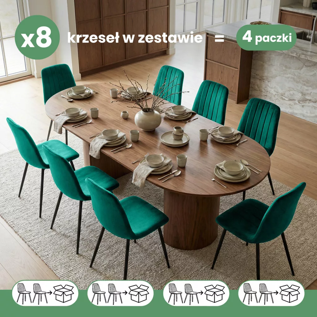 A welur székek az elegancia és a kényelem tökéletes ötvözete, amelyek egyaránt jól mutatnak modern és klasszikus enteriőrökben. A puha kárpitás barátságos, otthonos karaktert ad nekik, míg az egyszerű forma univerzális felhasználhatóságot biztosít. Stílusos és praktikus kiegészítői az étkezőnek, nappalinek vagy akár irodai tereknek is. A 8 darabos szett ideális nagyobb családok vagy vendégszerető háztartások számára.