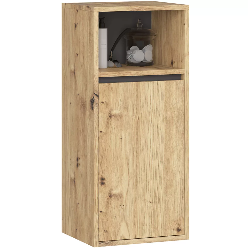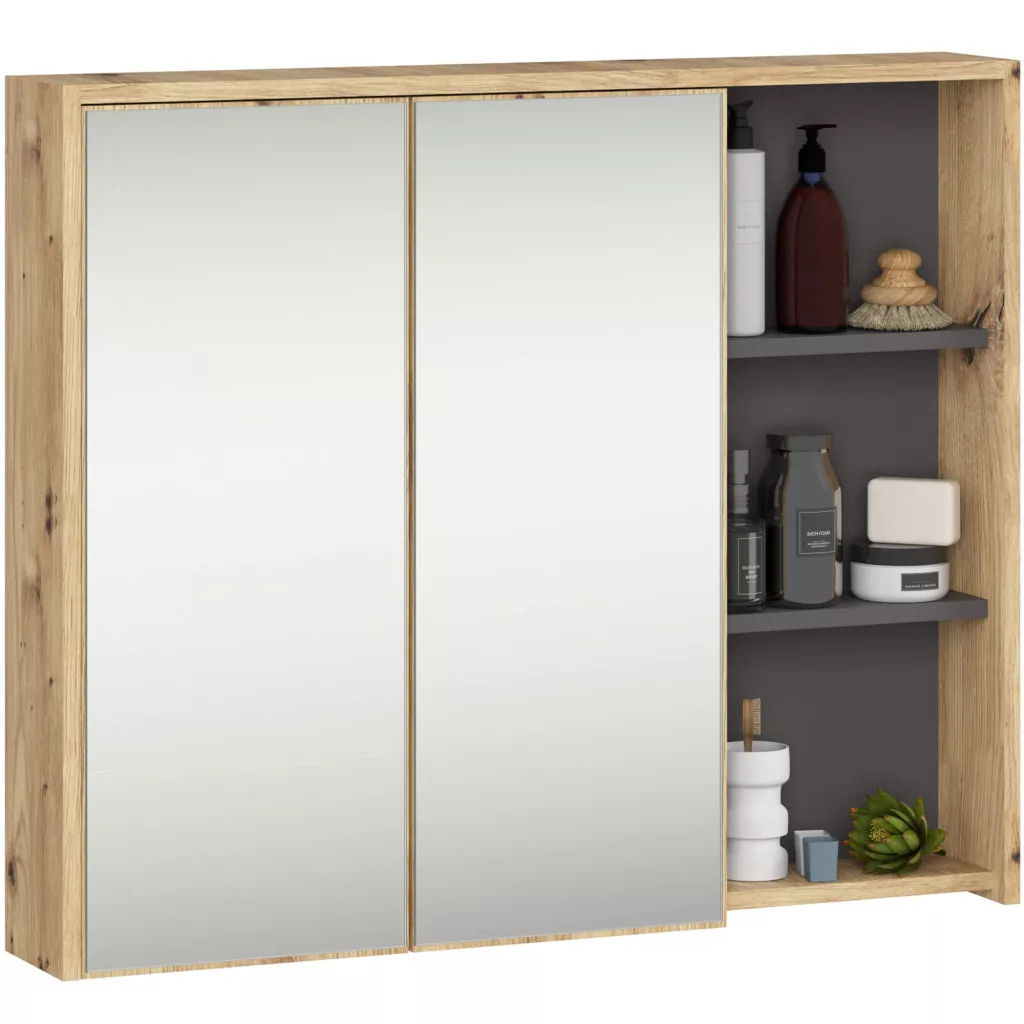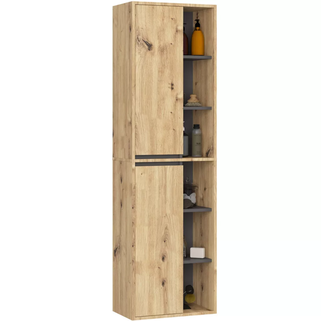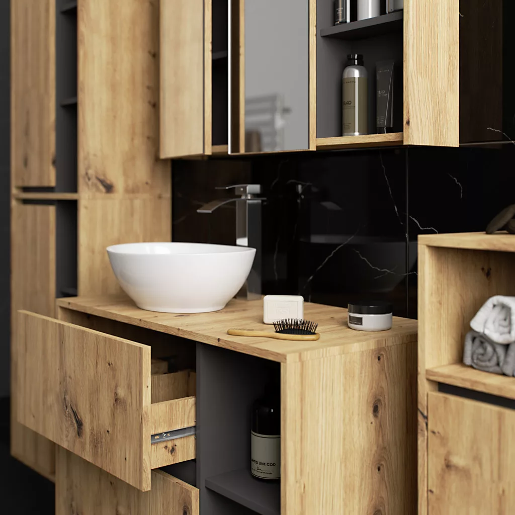 A VAMI fürdőszobabútor kollekció tökéletes választás a modern fürdőszobákba. A szett négy különálló elemből áll, amelyek szabadon kombinálhatók: egy 90 cm-es mosdó alatti szekrény, egy tükrös szekrény, egy magas oszlopszekrény és egy kiegészítő fali szekrény. Az Artisan tölgy és grafit szürke színkombináció időtálló eleganciát kölcsönöz.