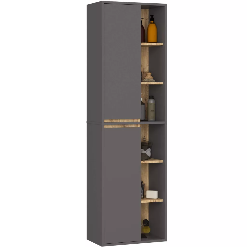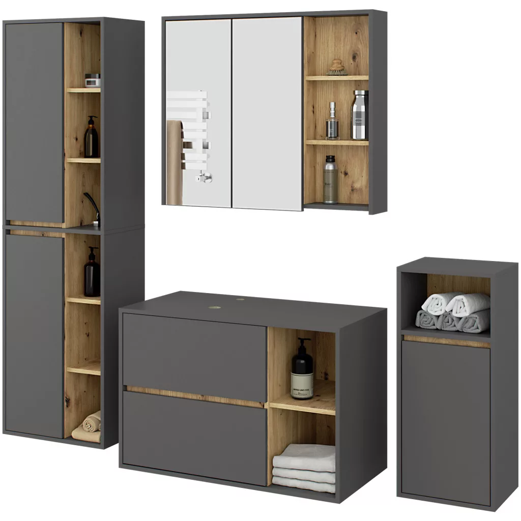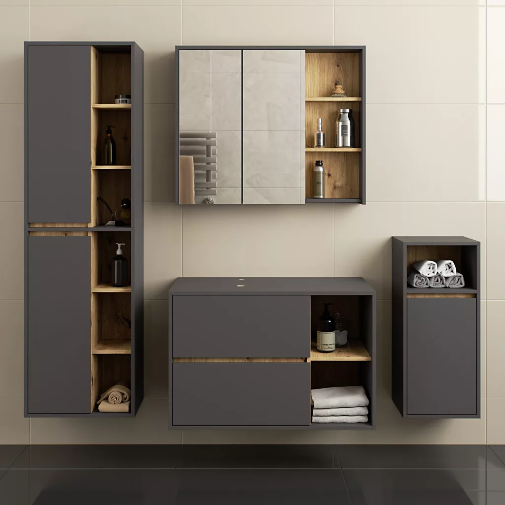 Modern, falra szerelhető fürdőszobabútor szett nyitott polcokkal és tágas tárolóhelyekkel, grafit szürke és artisan tölgy színkombinációban.