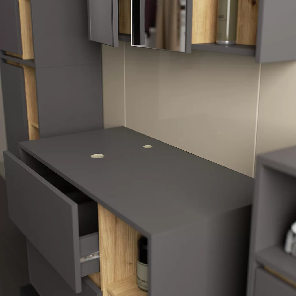 A VAMI fürdőszobabútor kollekció tökéletes választás a modern otthonokba. A grafit szürke matt felületek és az artisan tölgy részletek elegáns kontrasztot alkotnak, míg a nyitott polcrendszer lehetővé teszi a dekoratív és praktikus tárolást egyaránt. A szett négy független elemből áll, amelyek tetszés szerint kombinálhatók.