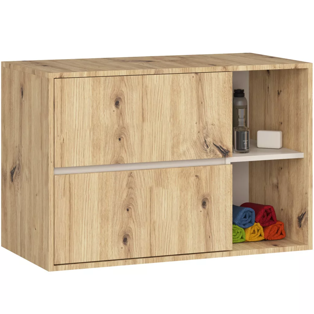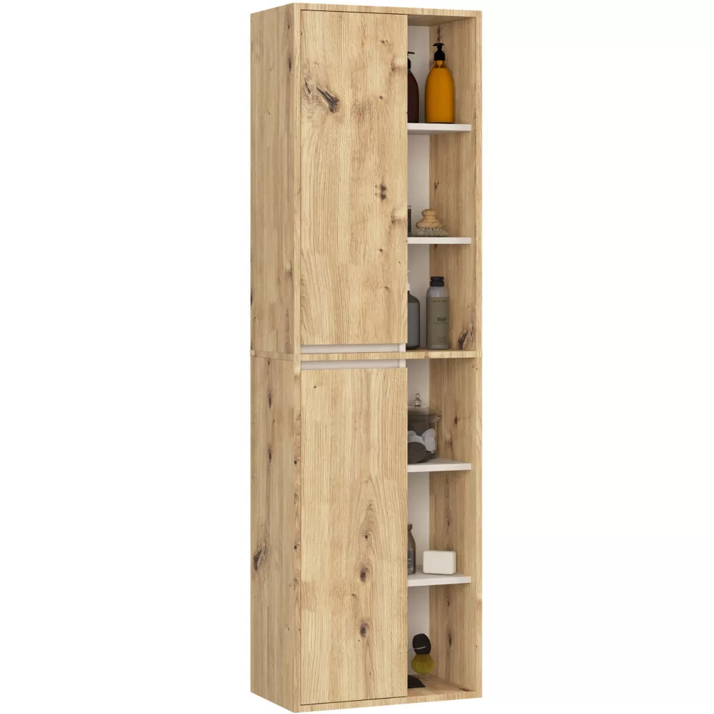 A VAMI fürdőszobabútor kollekció a modern fürdőszobák ideális választása. Az Artisan tölgy és kasmír színkombináció időtlen eleganciát kölcsönöz, míg a nyitott polcok könnyedséget és praktikus tárolóhelyet biztosítanak. A szett négy független egységből áll, amelyek tetszés szerint konfigurálhatók.