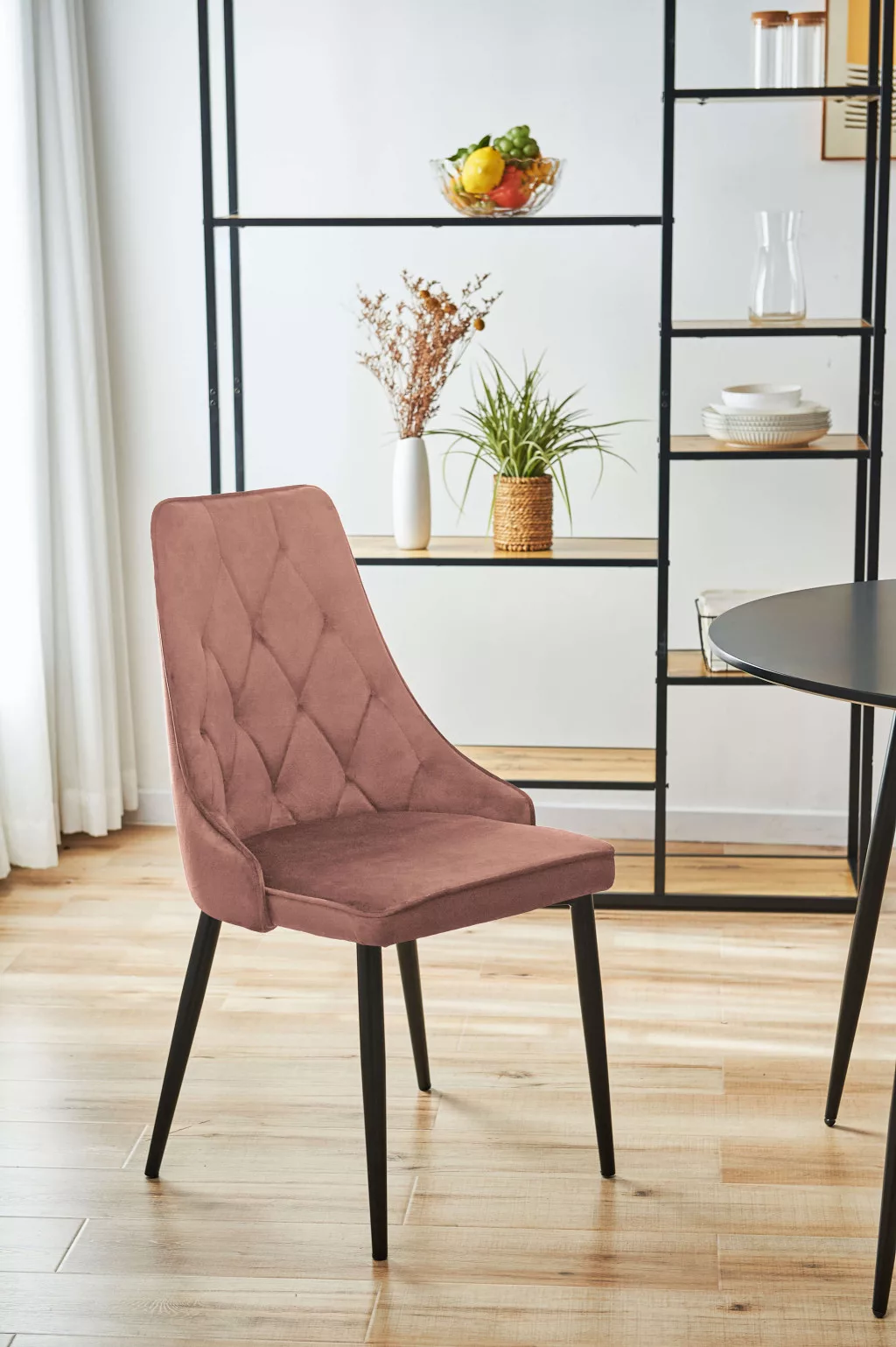 Elegáns, steppelt kárpitozású glamour étkezőszék rózsaszín bársony huzattal és fekete fémlábakkal. Tökéletes választás modern és stílusos enteriőrökbe.