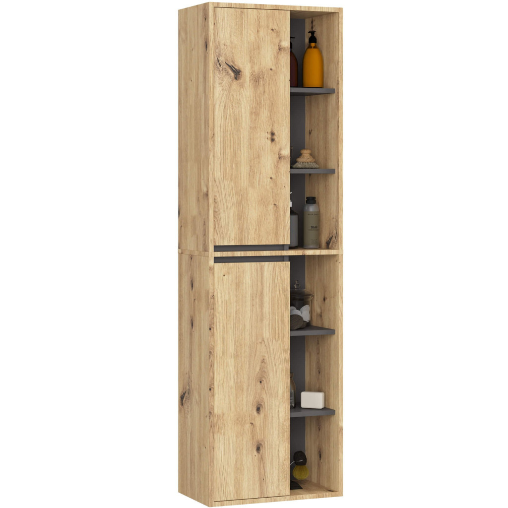 A VAMI W50 fali fürdőszobai szekrény tökéletes megoldást nyújt a fürdőszobai rendszerezéshez. A 170 cm magas szekrény két ajtós kialakítással és hat praktikus polccal rendelkezik, amelyek bőséges helyet biztosítanak a fürdőszobai kellékek tárolására. Az Artisan tölgy és szürke grafit színkombináció modern megjelenést kölcsönöz a bútornak.