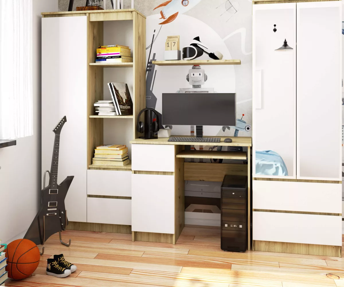 A Piksel számítógépasztal egy praktikus és stílusos bútor, amely tökéletesen ötvözi a funkcionalitást és a modern designt. Az artisan tölgy és fehér színkombináció elegáns megjelenést kölcsönöz, míg a kompakt méretezés lehetővé teszi, hogy kisebb terekben is kényelmesen elférjen. A bútor bal oldalán található szekrény és fiók bőséges tárolóhelyet biztosít, a jobb oldalon pedig kihúzható billentyűzettartó található.