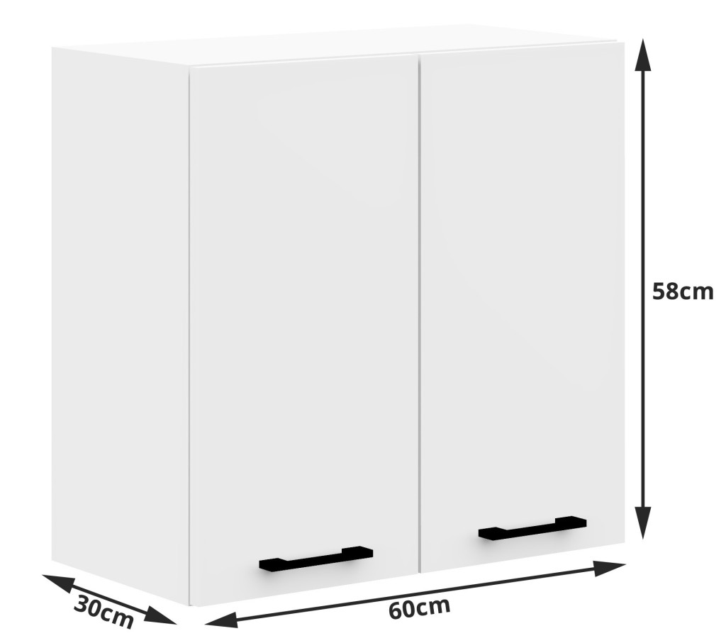 Modern, fehér fali konyhaszekrény az Oliwia kollekcióból, praktikus tárolási megoldásokkal. A 60 cm széles szekrény matt fehér kivitelben, fekete fogantyúkkal tökéletes választás a modern konyhákba.