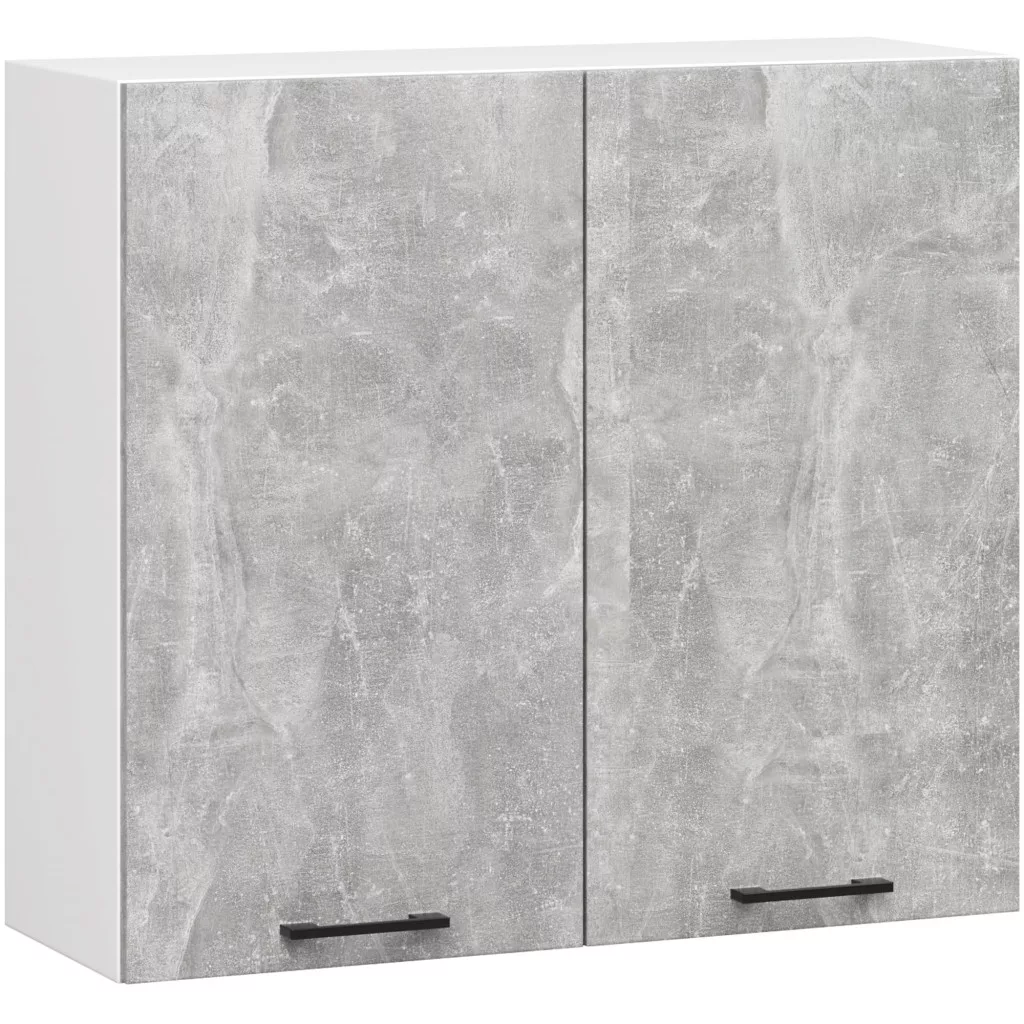 Modern, 80 cm széles falra szerelhető konyhaszekrény két polccal, amely tökéletesen ötvözi a fehér korpusz és a beton hatású matt frontok eleganciáját. Ideális megoldás konyhai eszközök és élelmiszerek tárolására.