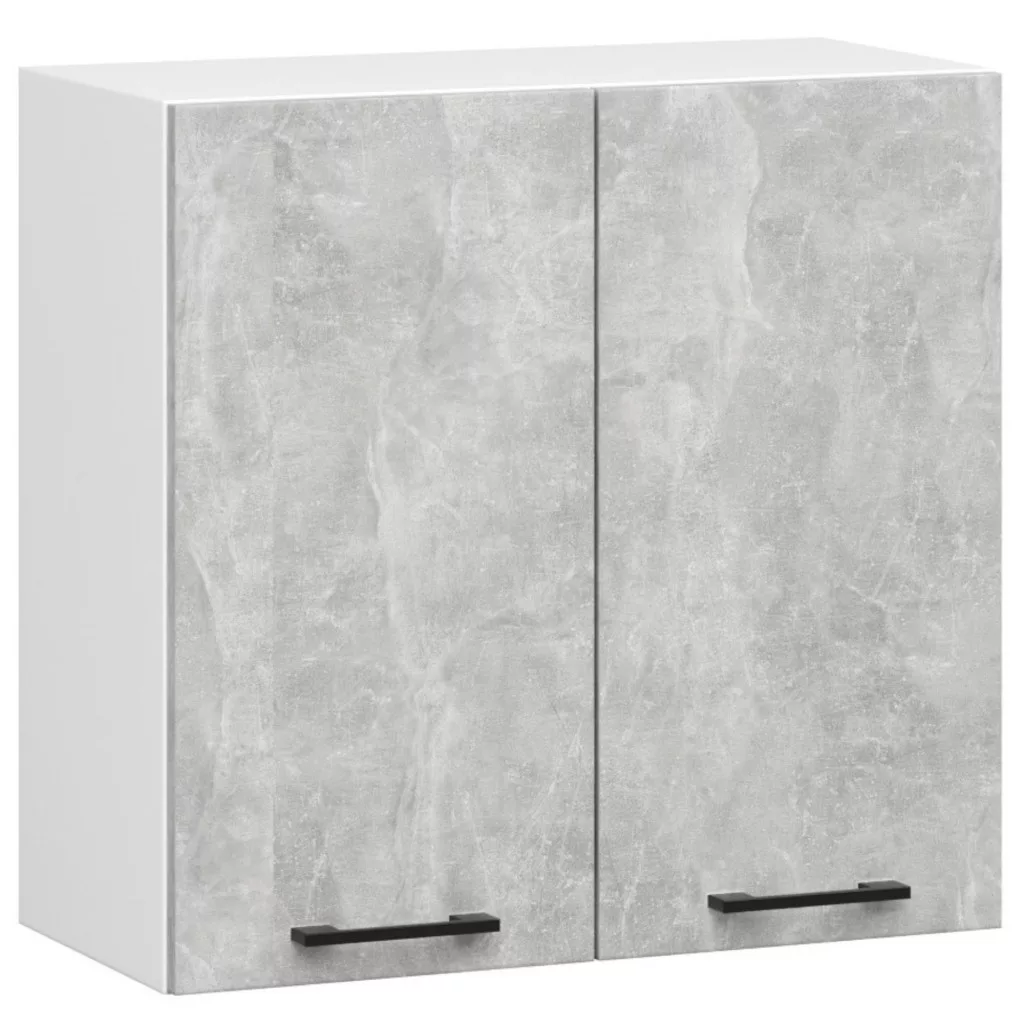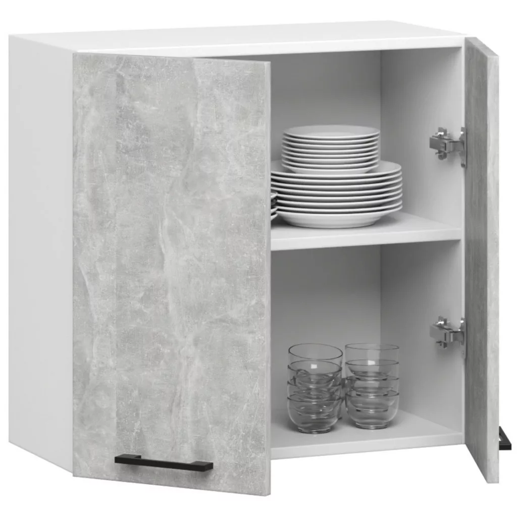 Modern, 60 cm széles fali konyhaszekrény a praktikus Oliwia kollekcióból. A fehér korpusz és beton hatású matt frontok elegáns kombinációja fekete fogantyúkkal, egy belső polccal a maximális tárolási lehetőségért.