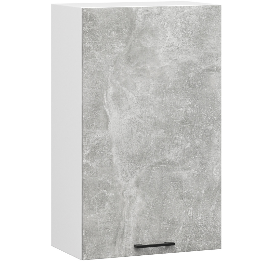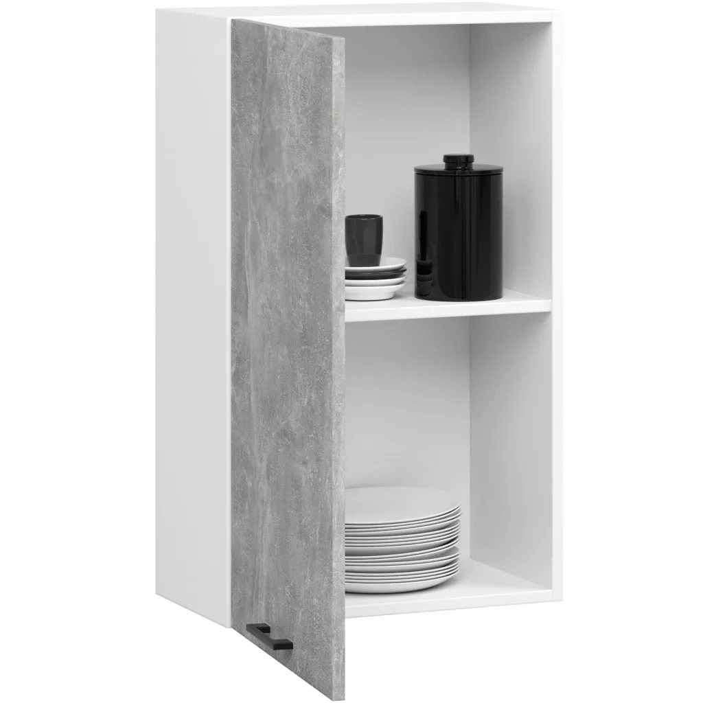 Modern, 50 cm széles fali konyhaszekrény fehér korpusszal és matt beton hatású fronttal. Két praktikus polccal rendelkezik, tökéletes megoldást nyújtva a konyhai tároláshoz.