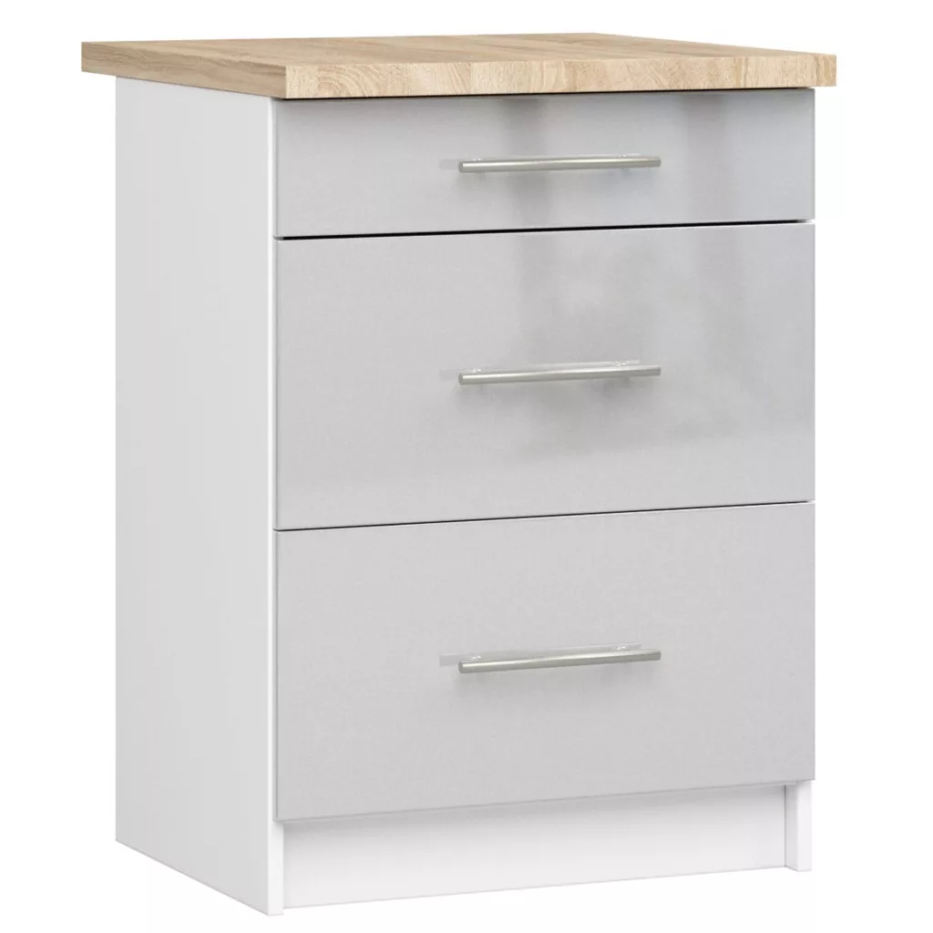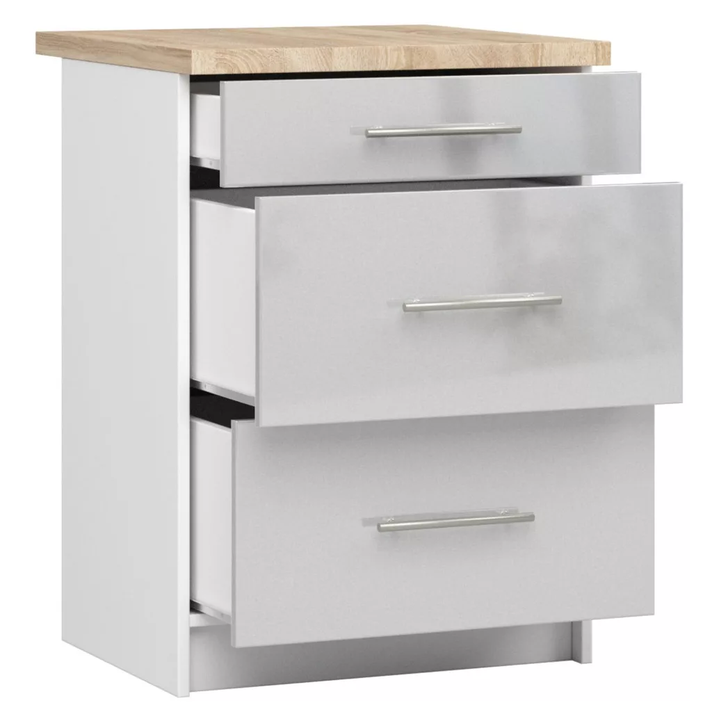 Modern konyhai alsószekrény három tágas fiókkal, fehér korpusszal és magasfényű metál frontokkal. A sonoma tölgy munkalappal és inox fogantyúkkal felszerelt szekrény tökéletes tárolási megoldást kínál a konyhában.