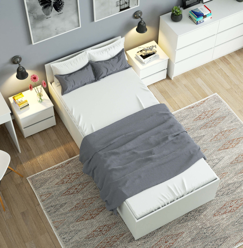 Az ágy különlegessége a gázrugós emelőszerkezet, amely könnyű hozzáférést biztosít a tárolótérhez. A matt fehér felület időtlen eleganciát kölcsönöz a bútornak.