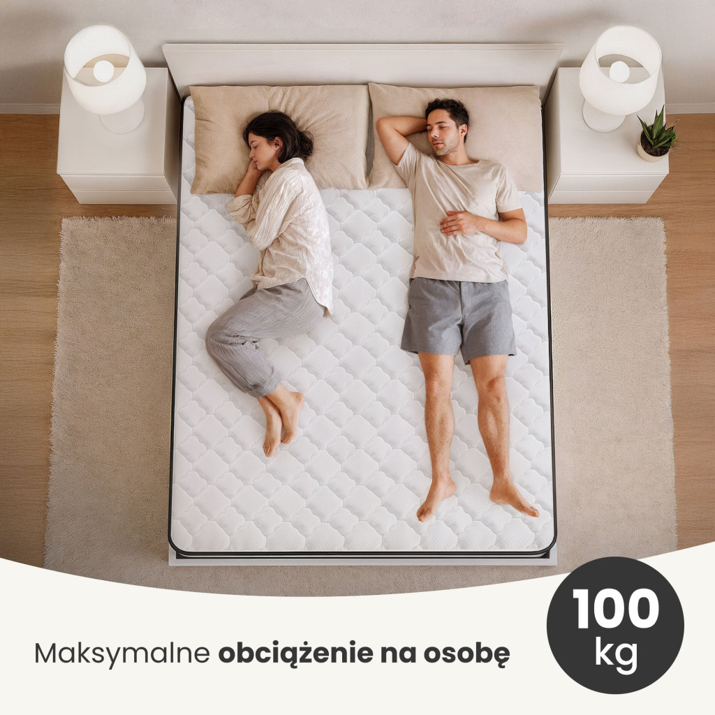 A matrac optimális légáteresztő képességgel rendelkezik, amely biztosítja a megfelelő szellőzést alvás közben. Ideális választás nagy kétágyas ágyakhoz, ahol mindkét partner számára fontos a kényelmes és egészséges alvás. A matrac akár 100 kg/fő terhelést is elbír, így hosszú távon megbízható megoldást kínál. A fehér színű kialakítás bármilyen hálószobai stílushoz illeszkedik.