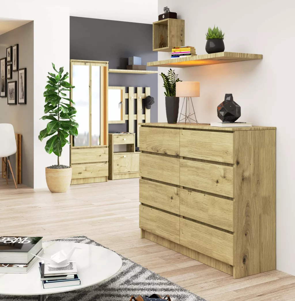 Modern és praktikus 8-fiókos komód, amely tökéletes tárolási megoldást kínál. Az Artisan tölgy kivitelben készült bútor kiváló minőségű laminált bútorlapból készült, ABS élzárással a tartósság érdekében.