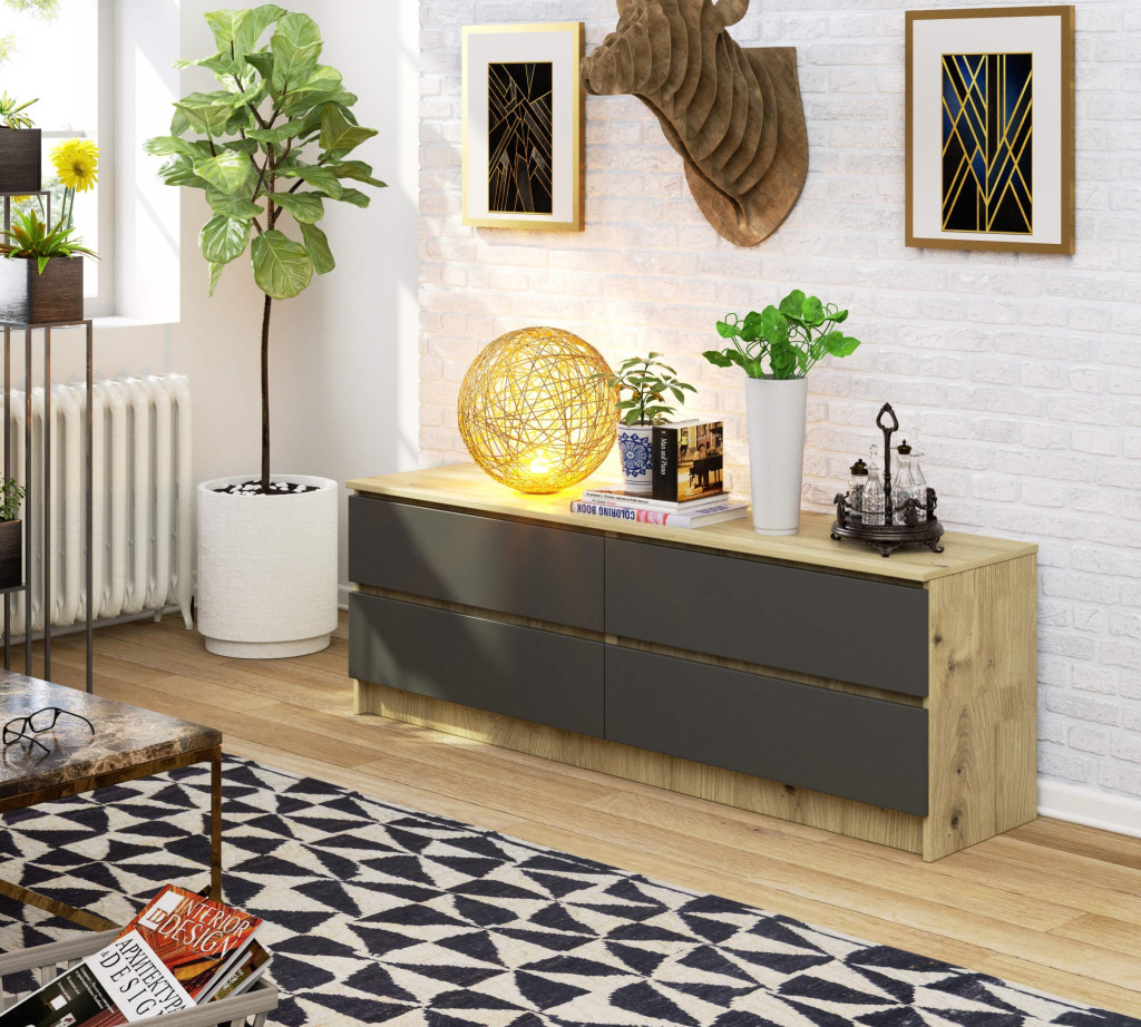Modern, széles komód 4 tágas fiókkal, kopásálló laminált lapból készítve. Az Artisan tölgy test és szürke matt frontok elegáns kombinációja tökéletes tárolási megoldást kínál nappalijába vagy hálószobájába.